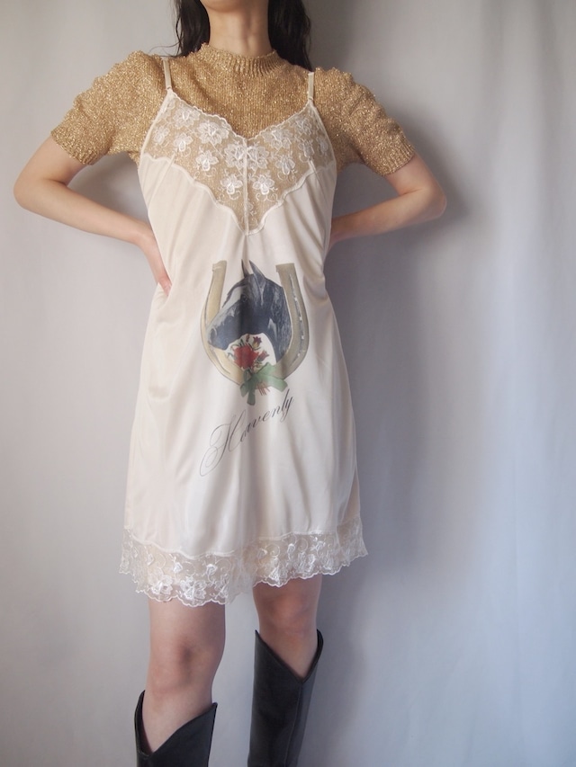 Details 透け感がございます。(写真15) ★ダメージ 左サイドに汚れがございます。(写真16) プリントにムラがございます。(写真17.18) ★表記サイズ 100-95 ★実寸 着丈 約90㎝~(ストラップで、調節可能。) 身幅 約48㎝ 多少の誤差はご容赦くださいませ。 モデル身長163㎝ ★素材 身生地 ナイロン 100% レース ナイロン 100% ★ダメージ以外にも、全体に古着商品特有の使用感があります。実際と若干お色味が異なる場合があります。ご了承お願い致します。 ★お客様のご都合によるキャンセル、返品、交換は固くお断りしております。