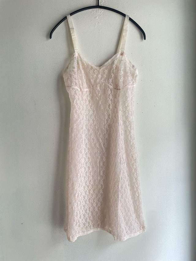 Details 透け感がございます。(写真12) ★ダメージ 前側に薄い汚れがございます。(写真13) 後ろ側に小さな汚れがございます。(写真14) ★表記サイズ 85-90 ★実寸 着丈 約89㎝ 身幅 約46㎝ 多少の誤差はご容赦くださいませ。 モデル身長163㎝ ★素材 身生地 ポリエステル100% レース地組織 ナイロン100% ★ダメージ以外にも、全体に古着商品特有の使用感があります。実際と若干お色味が異なる場合があります、ご了承お願い致します。 ★お客様のご都合によるキャンセル、返品、交換は固くお断りしております。
