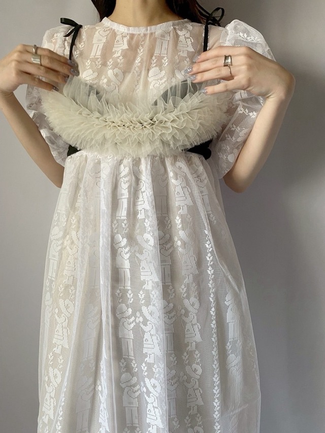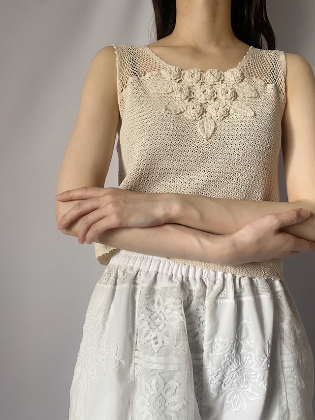 Details ヴィンテージのハート型かぎ編みとオーガンジーのフリルが施されたリメイクアイテムです。存在感のある一着です。リボンで着丈の調節が可能なので、自分だけのスタイルを楽しめます。 透け感がございます。(写真15) ★ダメージ 目立つダメージはございません。 ★表記サイズ 表記なし ★実寸 着丈 約15.5㎝~(前中心から採寸。リボンで調節可能。) 身幅 約35㎝ 多少の誤差はご容赦くださいませ。 モデル身長163㎝ ★素材 表記なし ★ダメージ以外にも、全体に古着商品特有の使用感があります。実際と若干お色味が異なる場合があります。ご了承お願い致します。 ★お客様のご都合によるキャンセル、返品、交換は固くお断りしております。