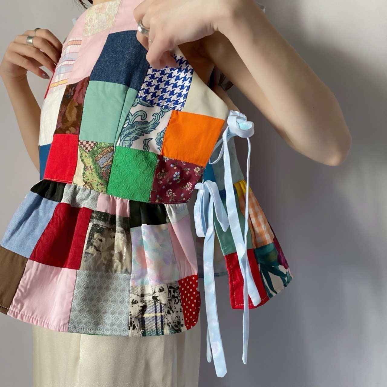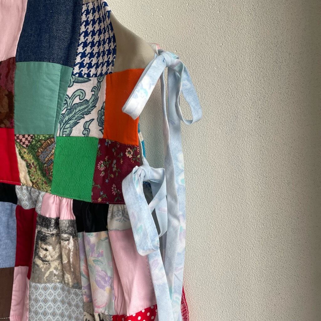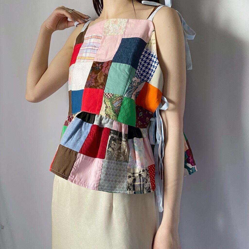 ヴィンテージの生地を使用したパッチワークキャミソール。個性的なデザインで、普段使いにも特別な日にもぴったりです。リボンで着丈と身幅を調節できるため、自分だけのスタイルを楽しめます。