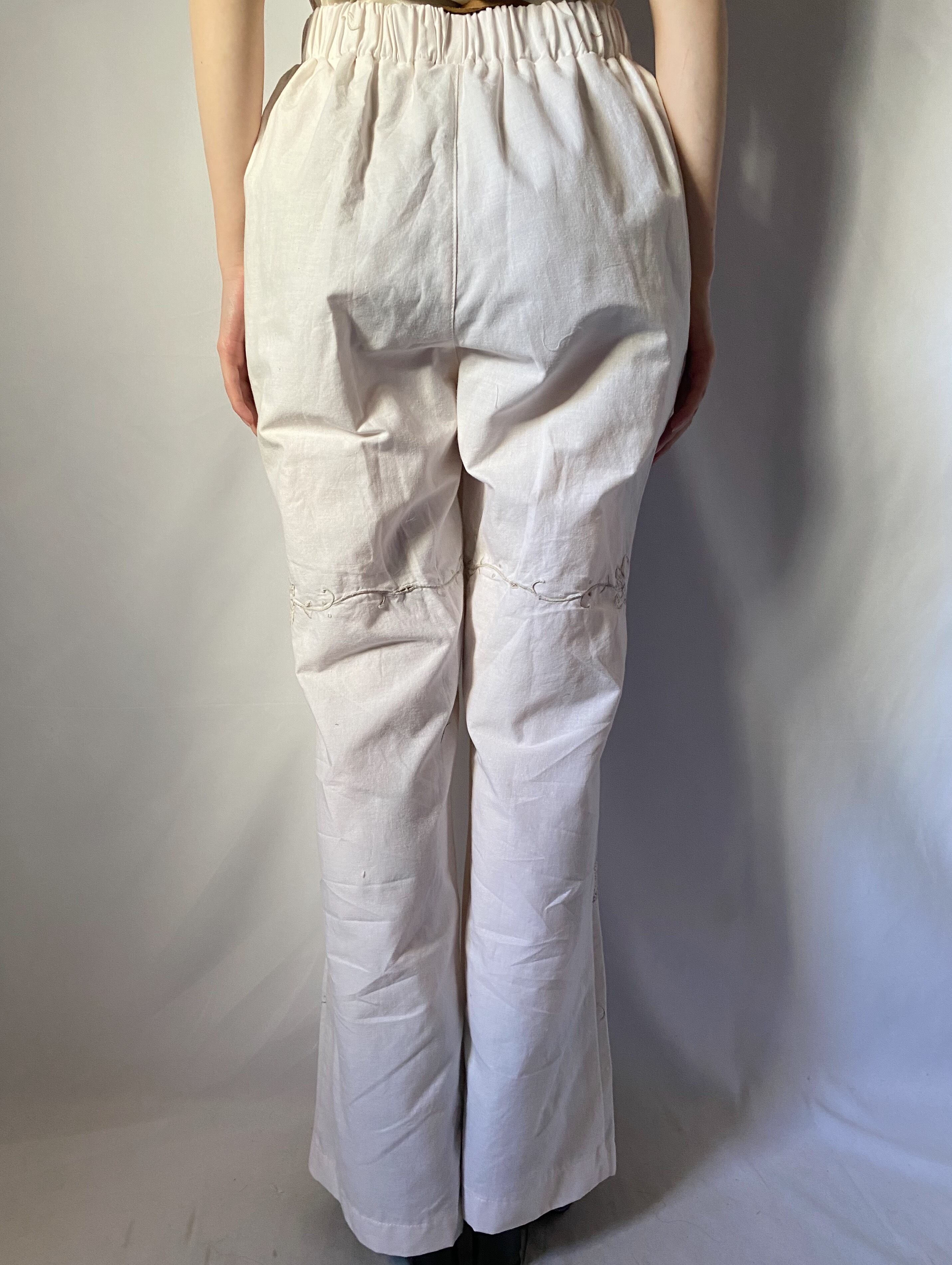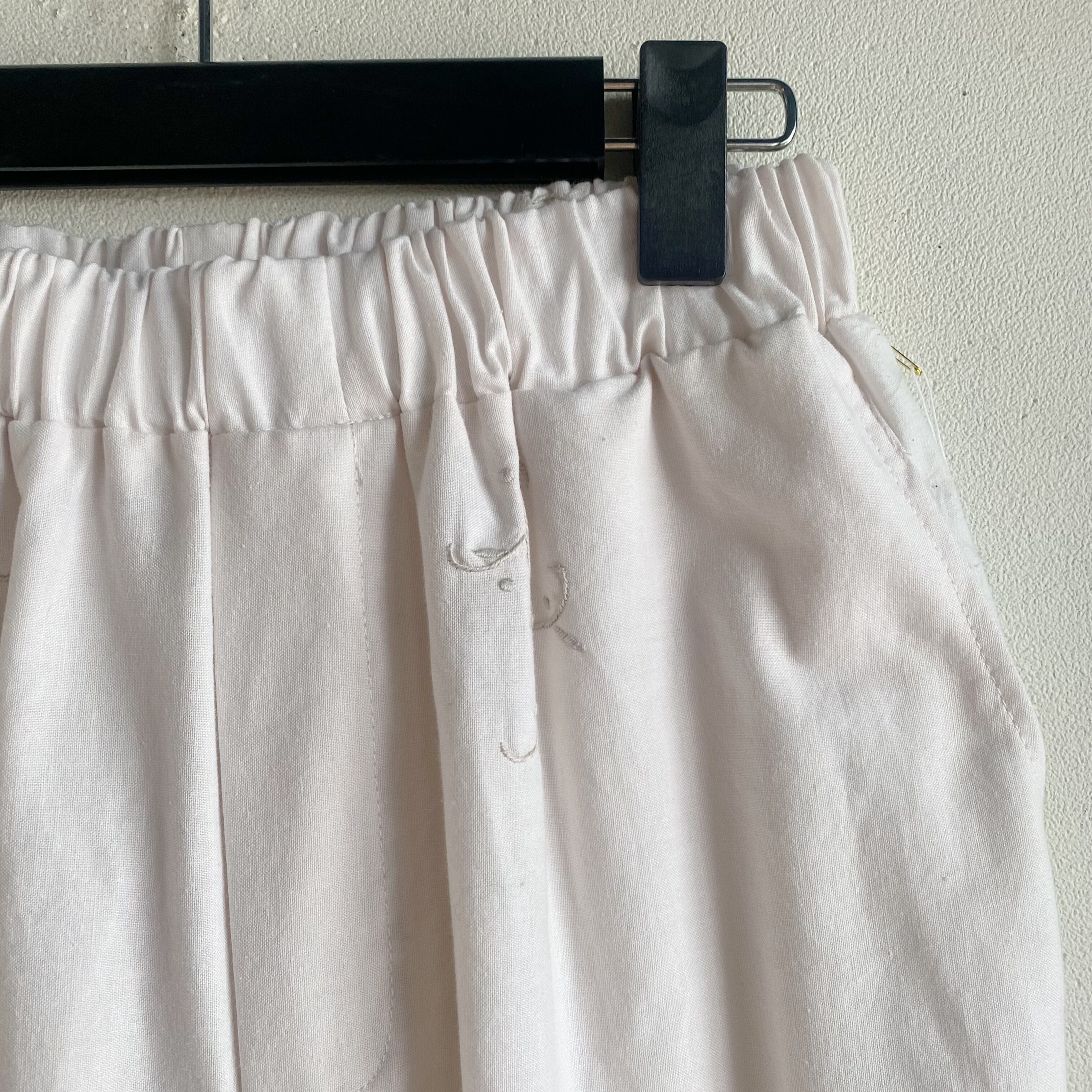 ホワイト刺繍パンツは、ビンテージ生地を使用した特別な一品です。鍵編みレースの繊細なデザインが魅力です。