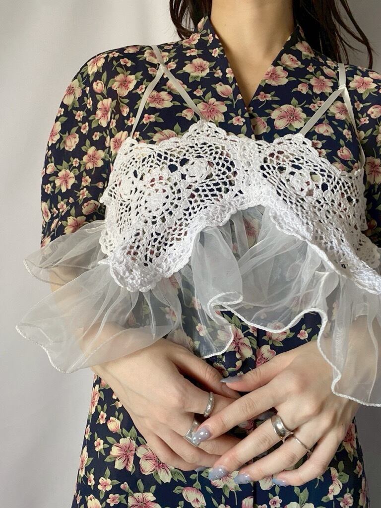 ヴィンテージのハート型かぎ編みとオーガンジーのフリルが施されたリメイクアイテムです。存在感のある一着です。リボンで着丈の調節が可能なので、自分だけのスタイルを楽しめます。