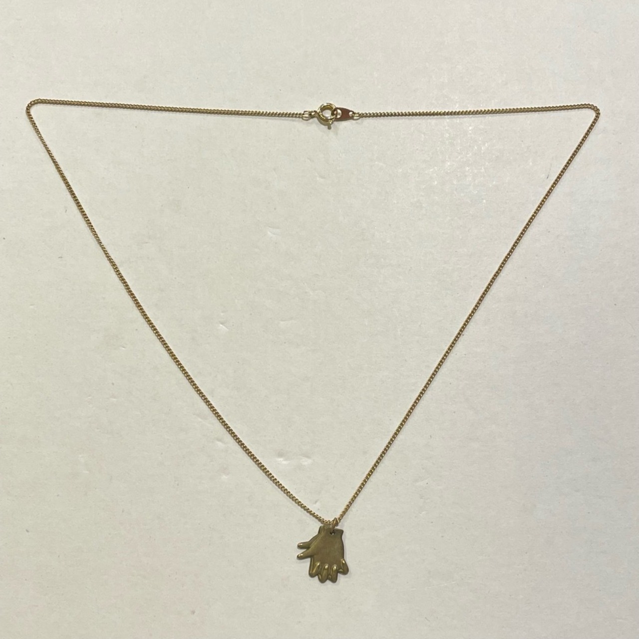 大人気のハンドモチーフです。シンプルでありながら目を引くデザインが魅力的な一品です。華やかなゴールドカラーが首元を美しく彩り、どんなスタイルにもマッチします。