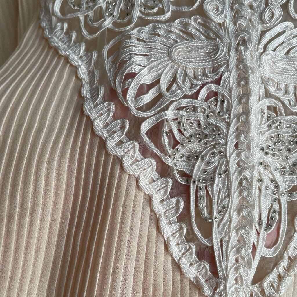 胸元には繊細なレースが贅沢に施され、上品さと可愛らしさを兼ね備えた一枚です。