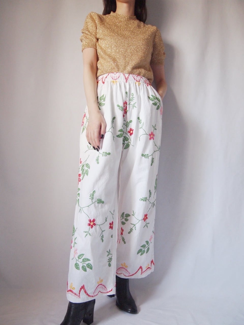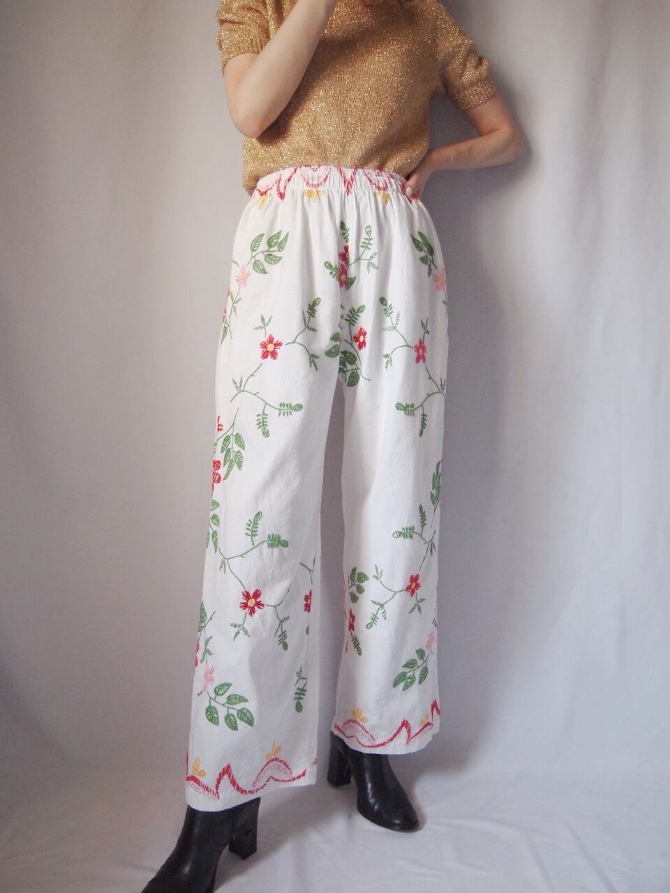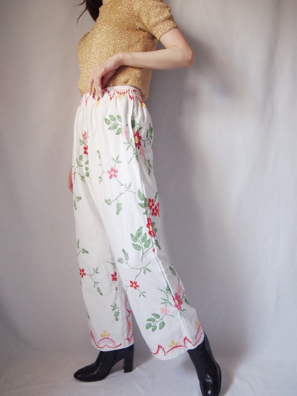 ホワイト花柄刺繍パンツ