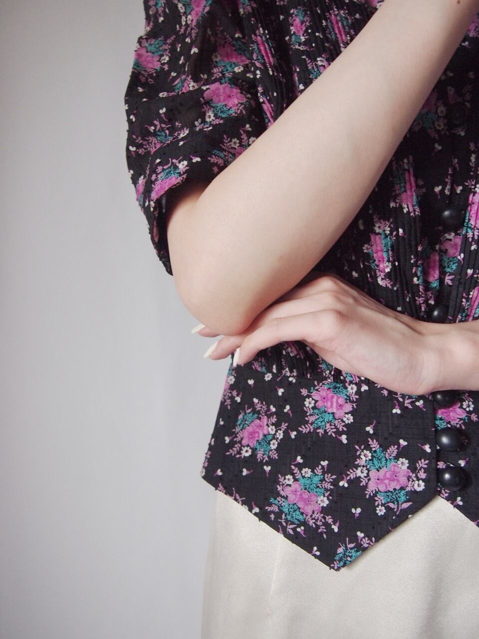 ブラック花柄プリーツブラウス