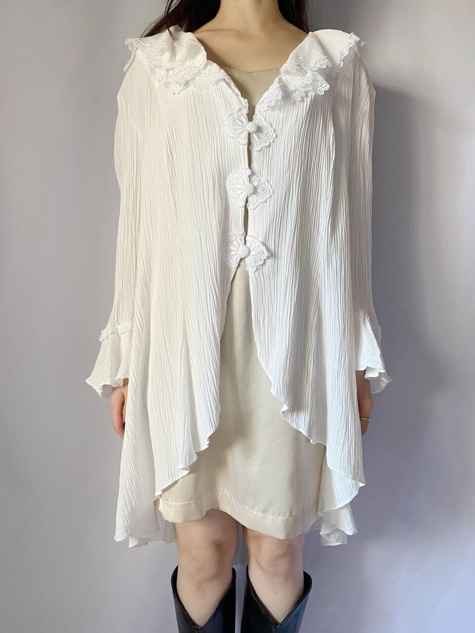 ホワイトフリルロングプリーツブラウス
