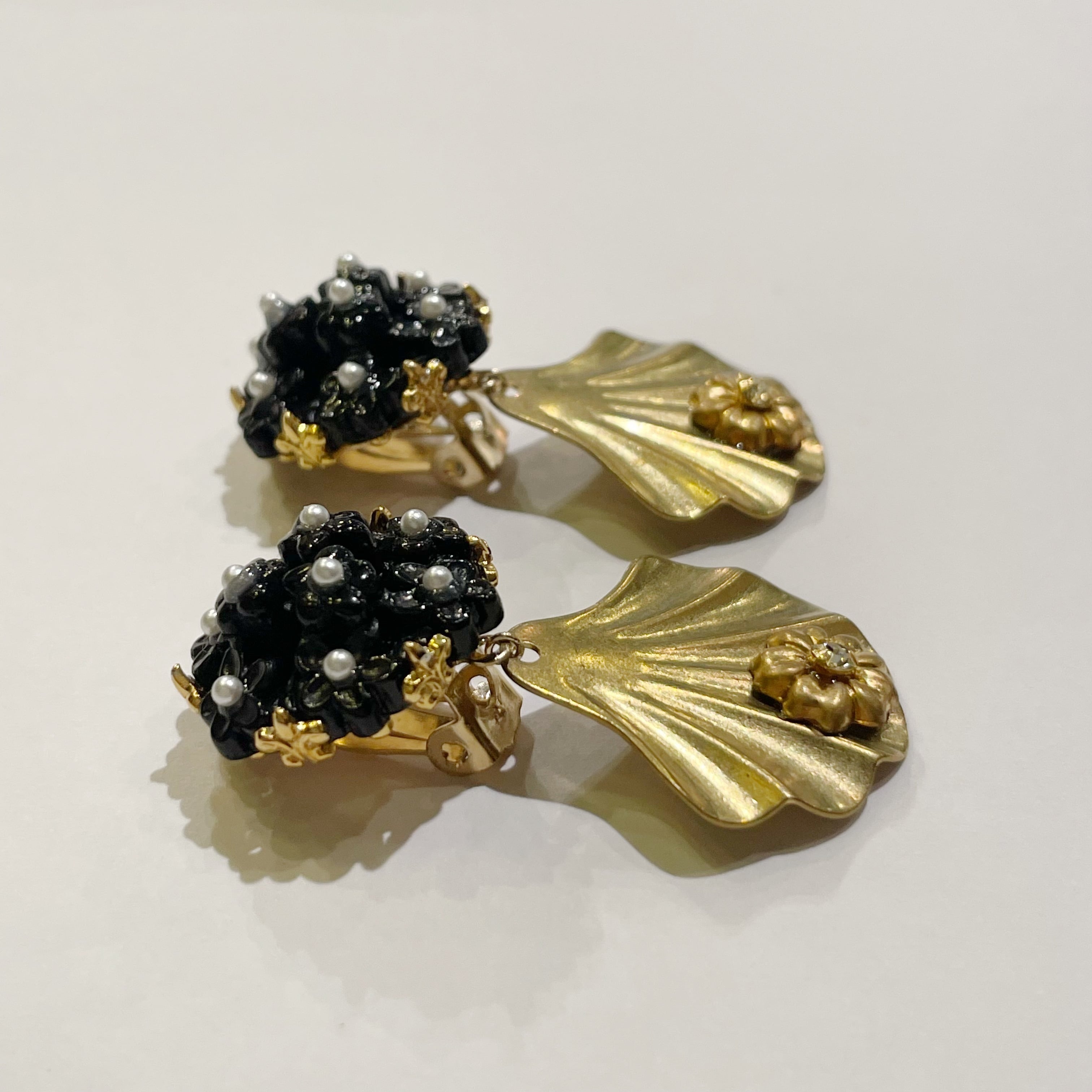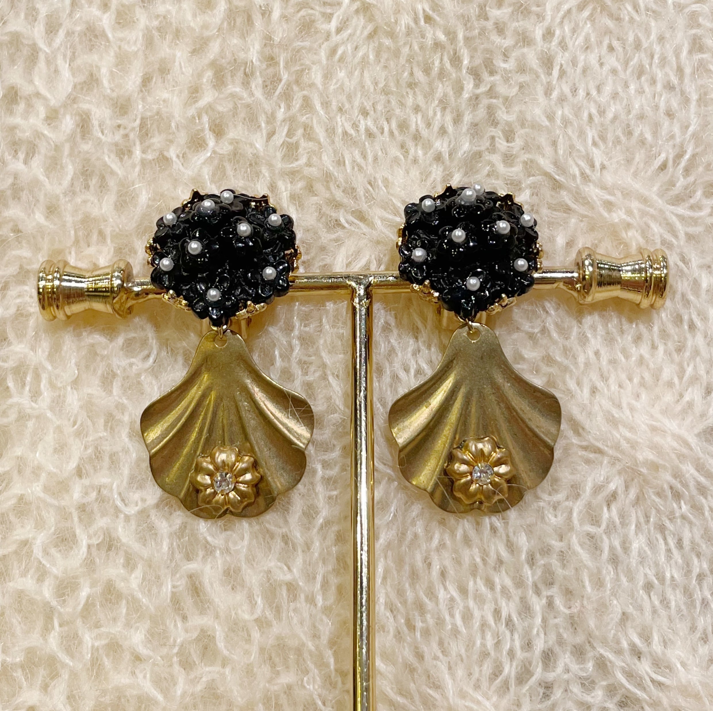 【Scent Of Jasmine】ブラックフラワー×ゴールドシェルイヤリング