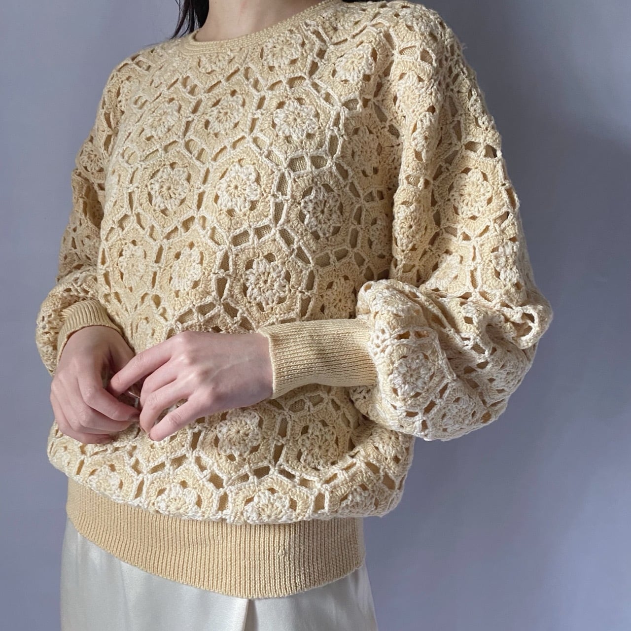 イエローベージュかぎ編みセーター