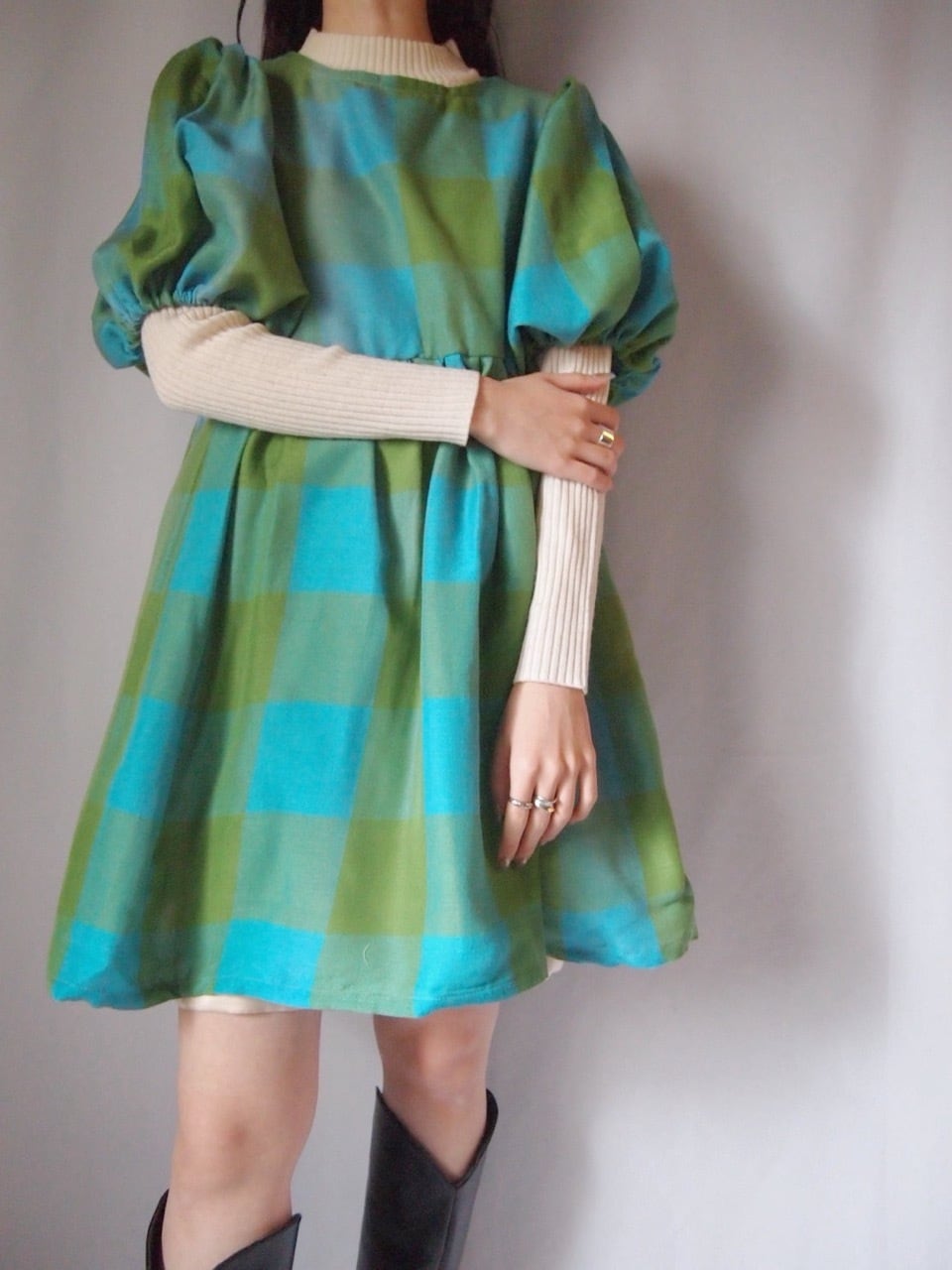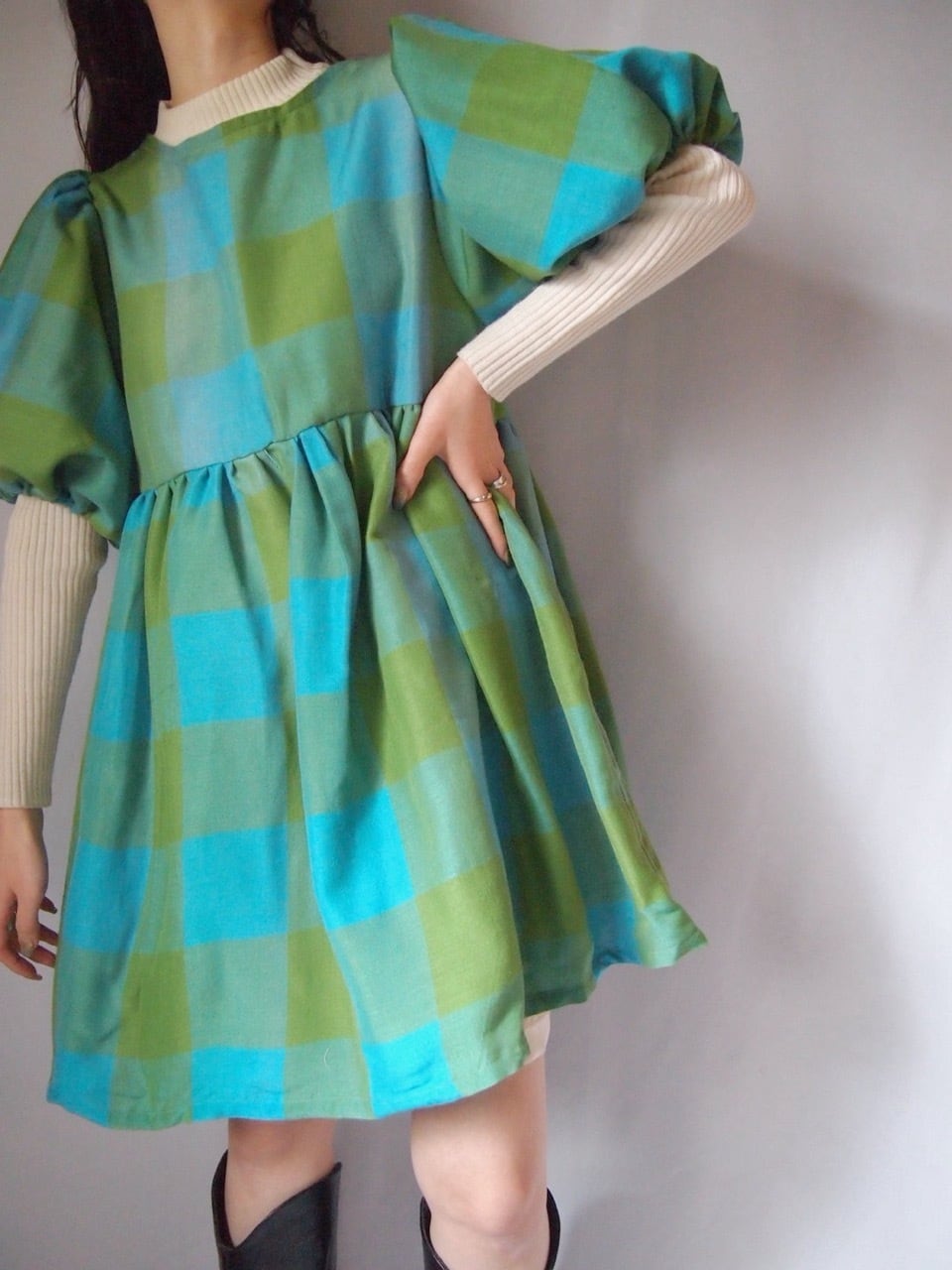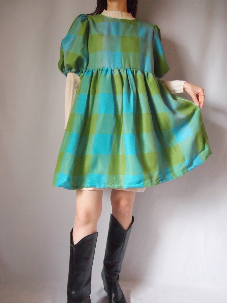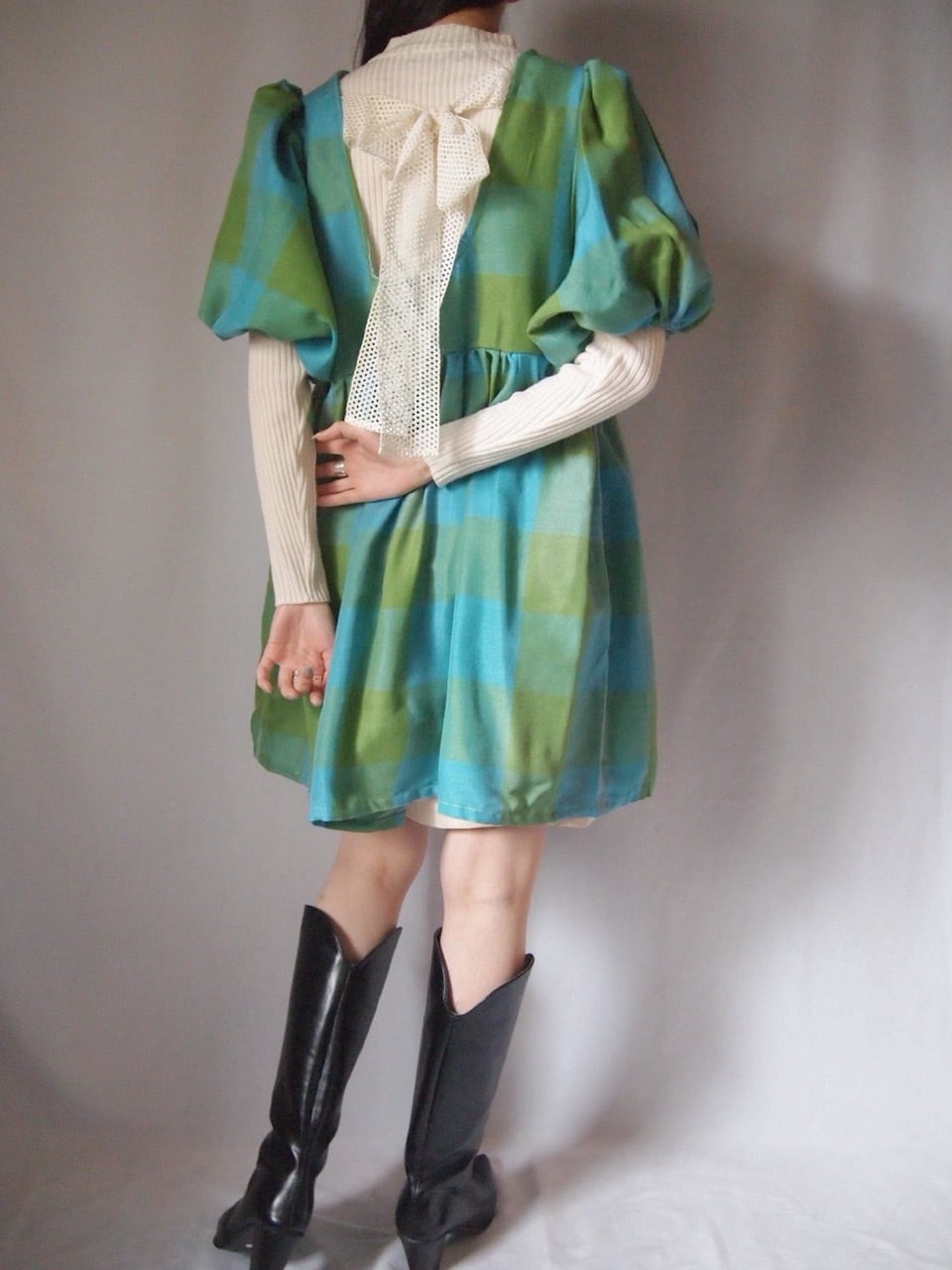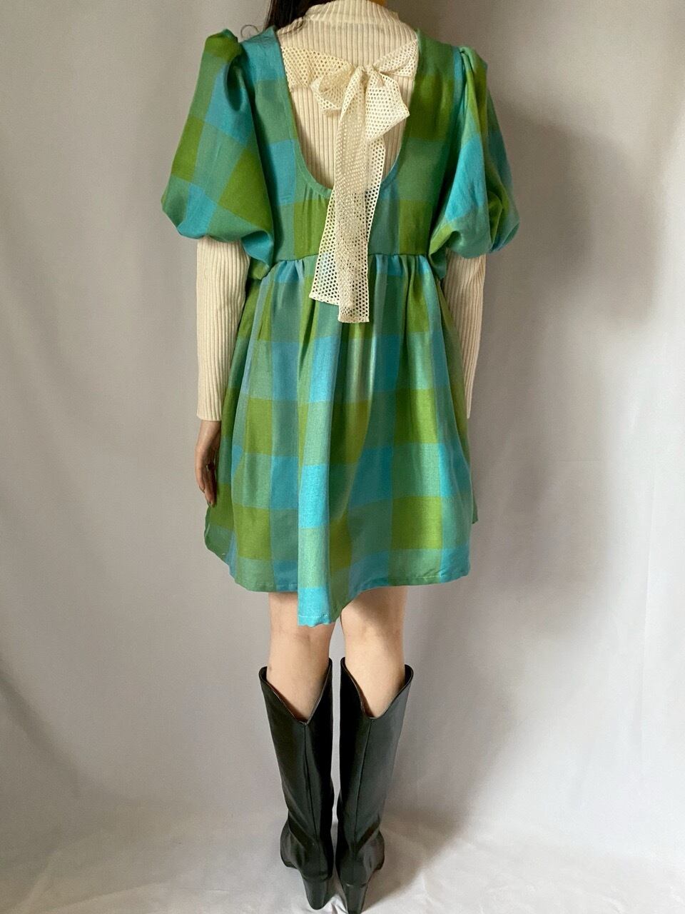 グリーン×ブルーチェックバックリボンワンピース