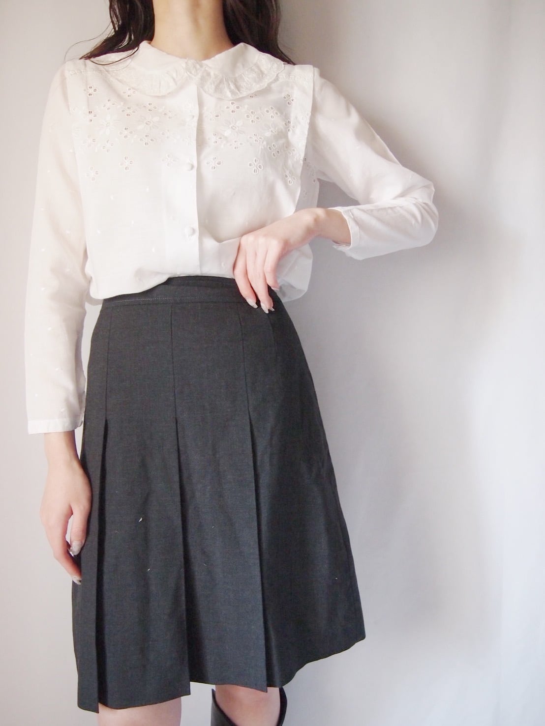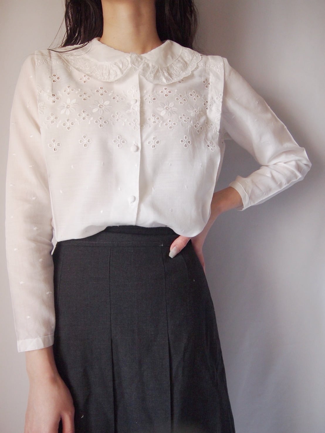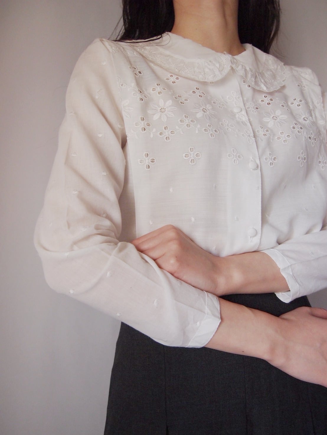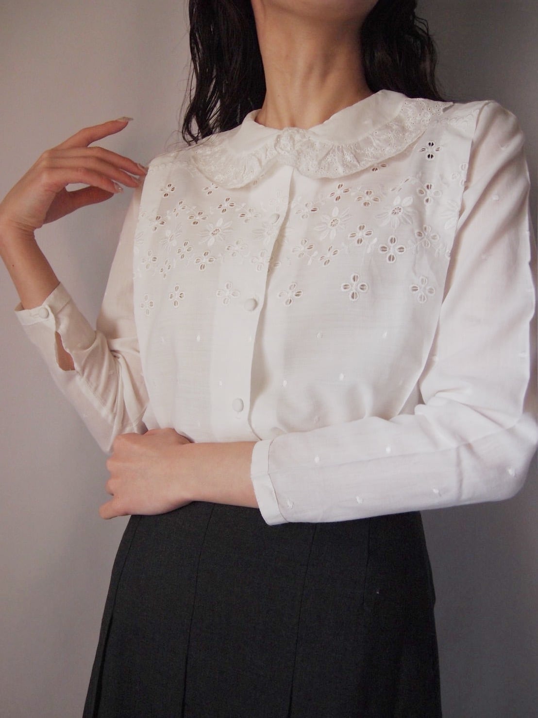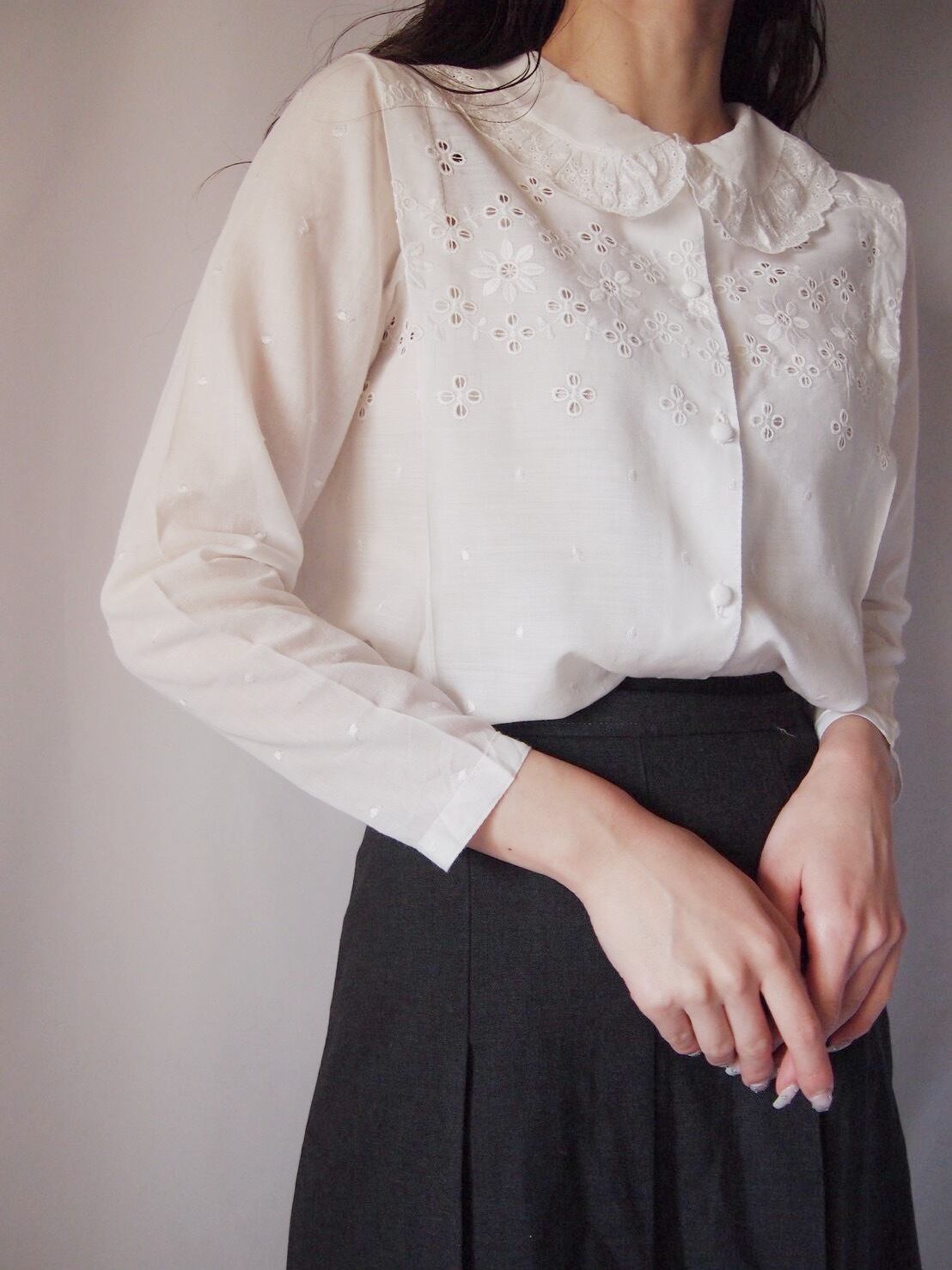 ホワイトレース刺繍タックブラウス
