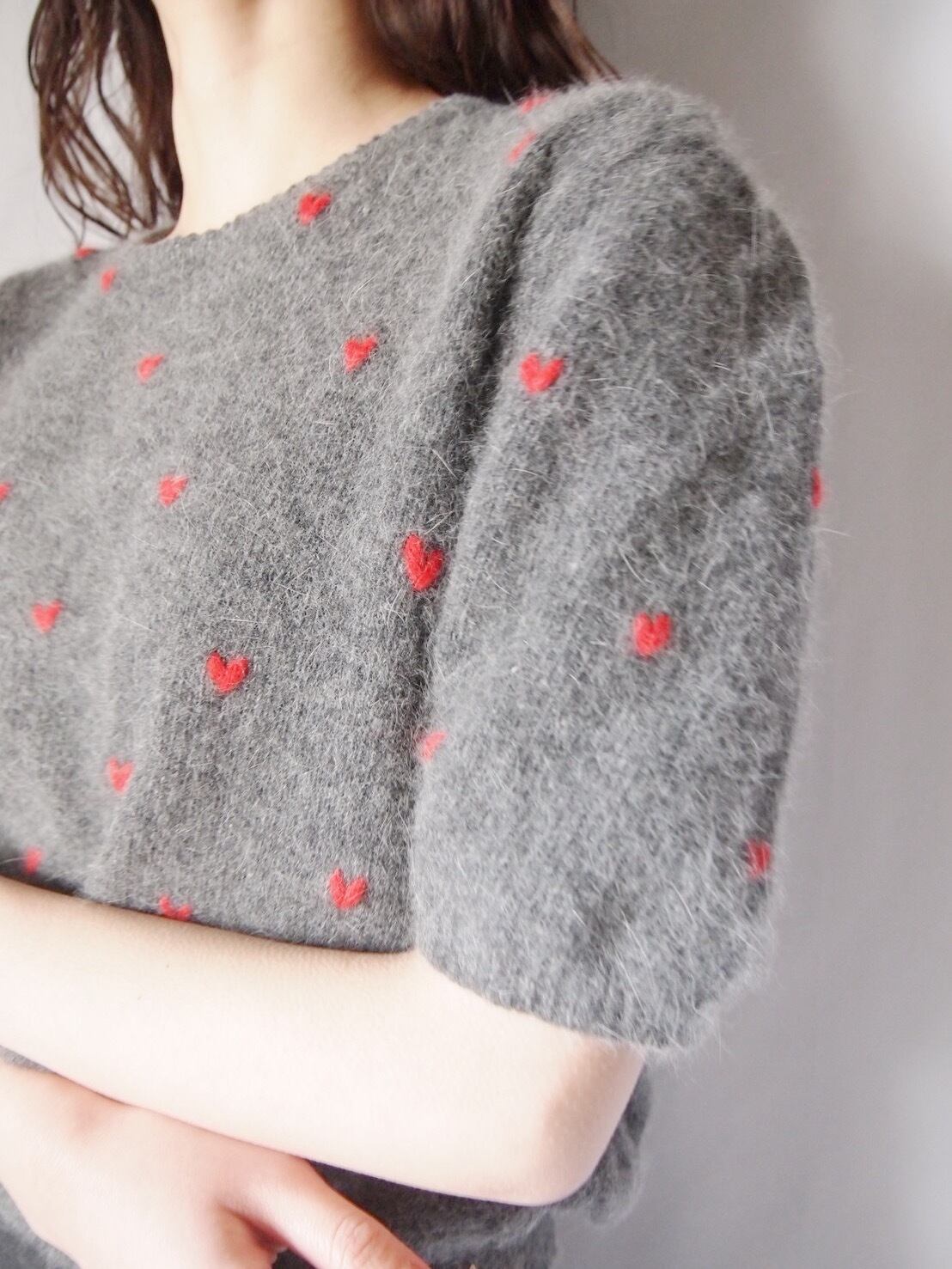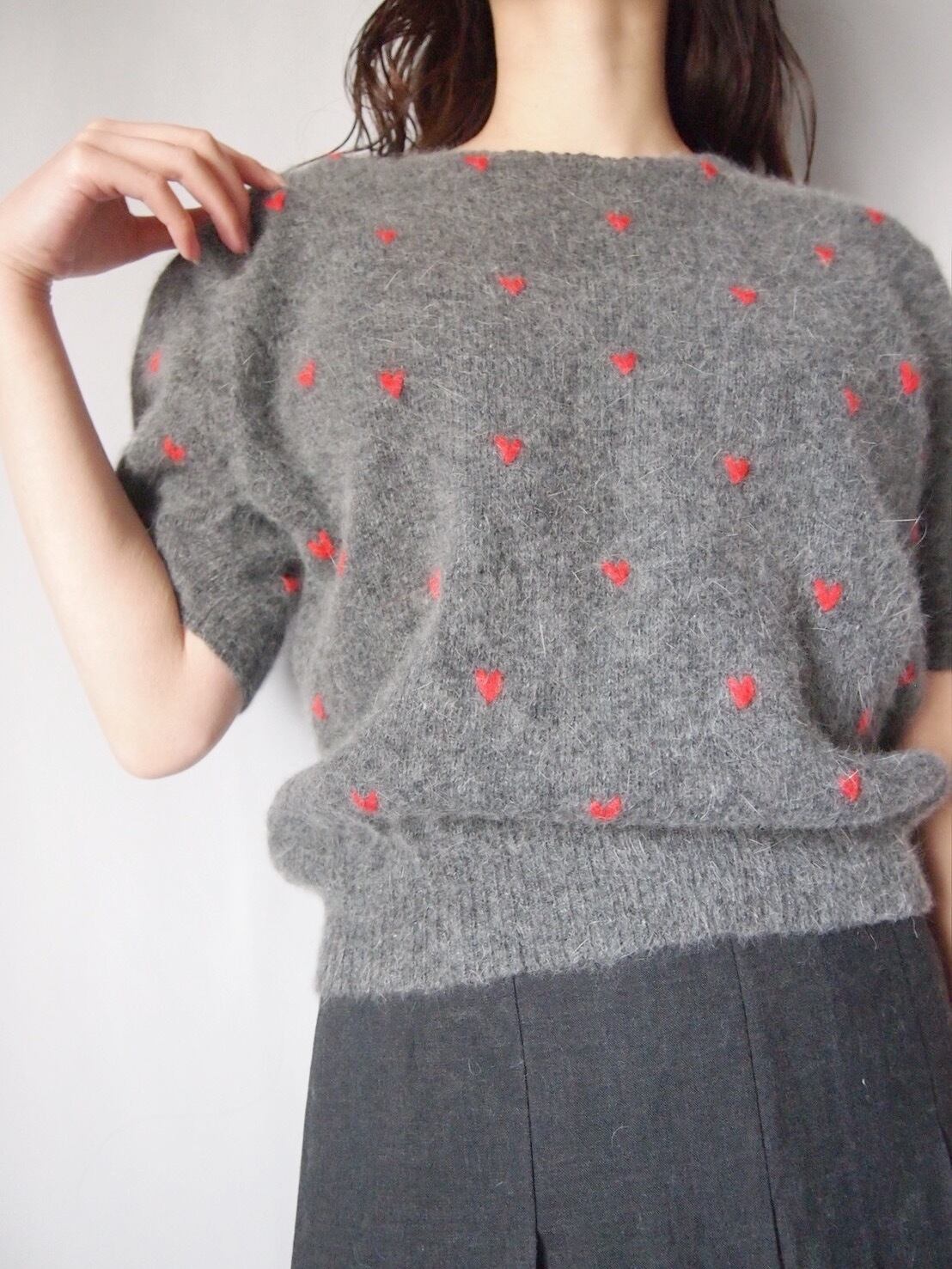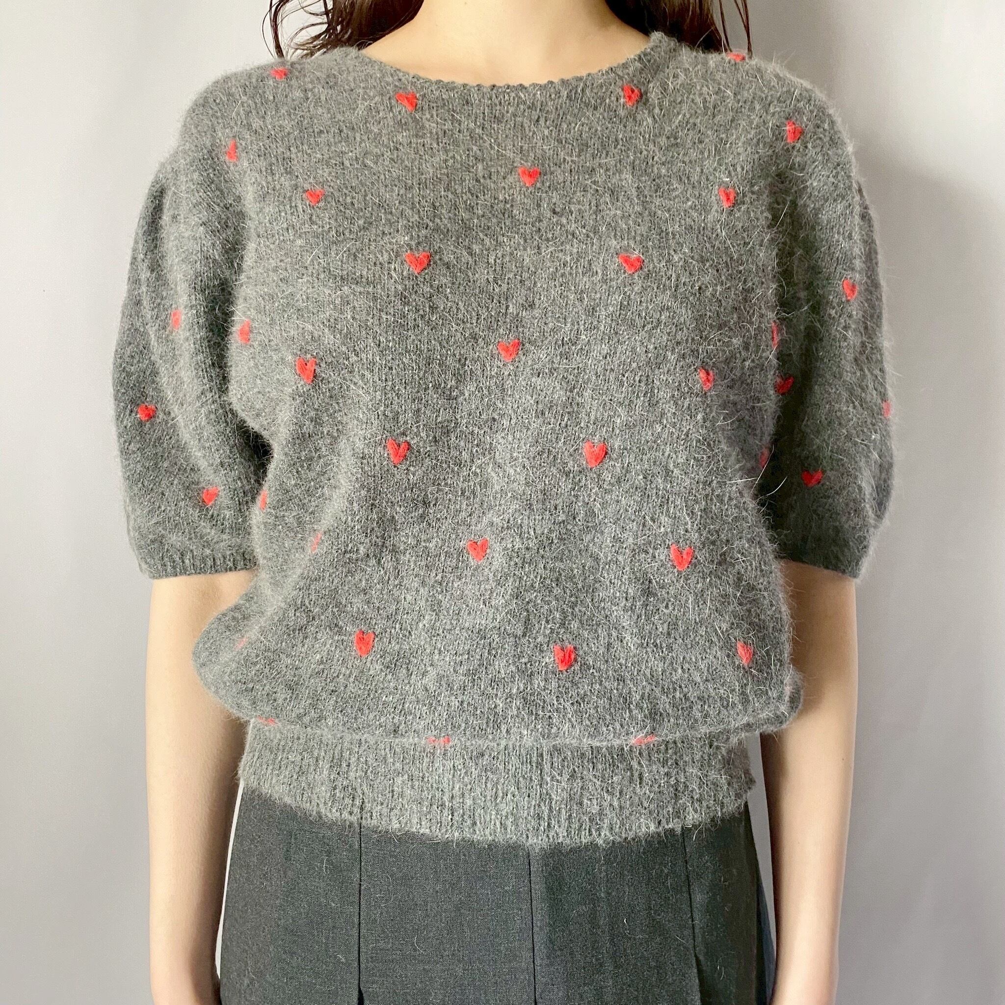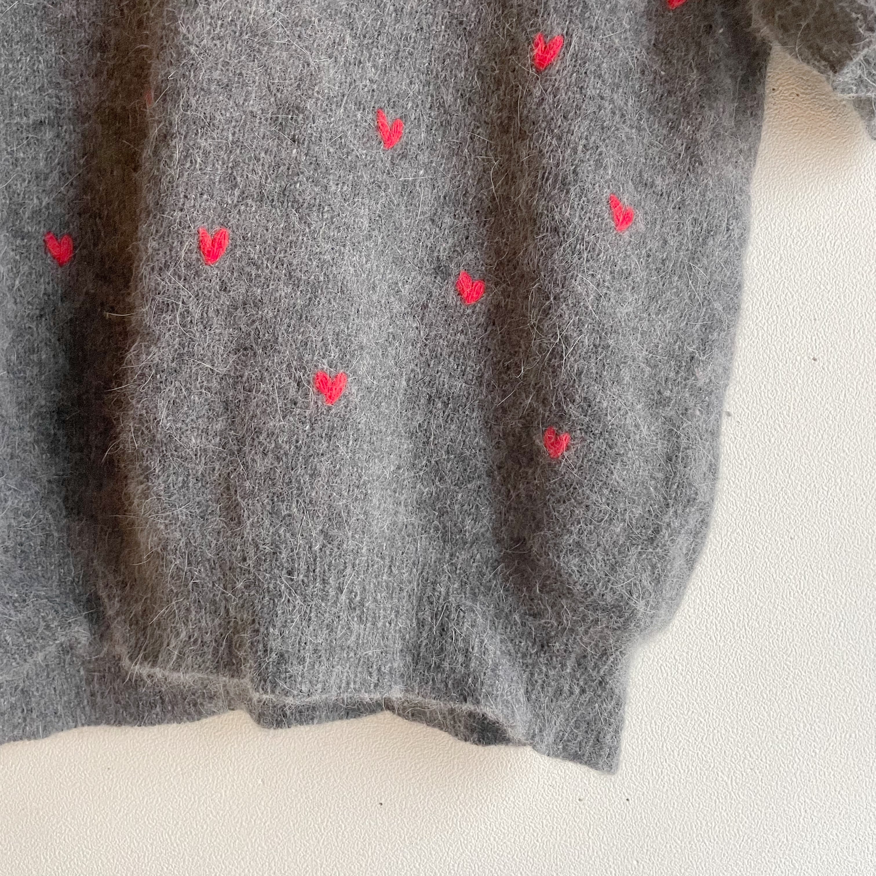 グレー×レッドハートニットトップス