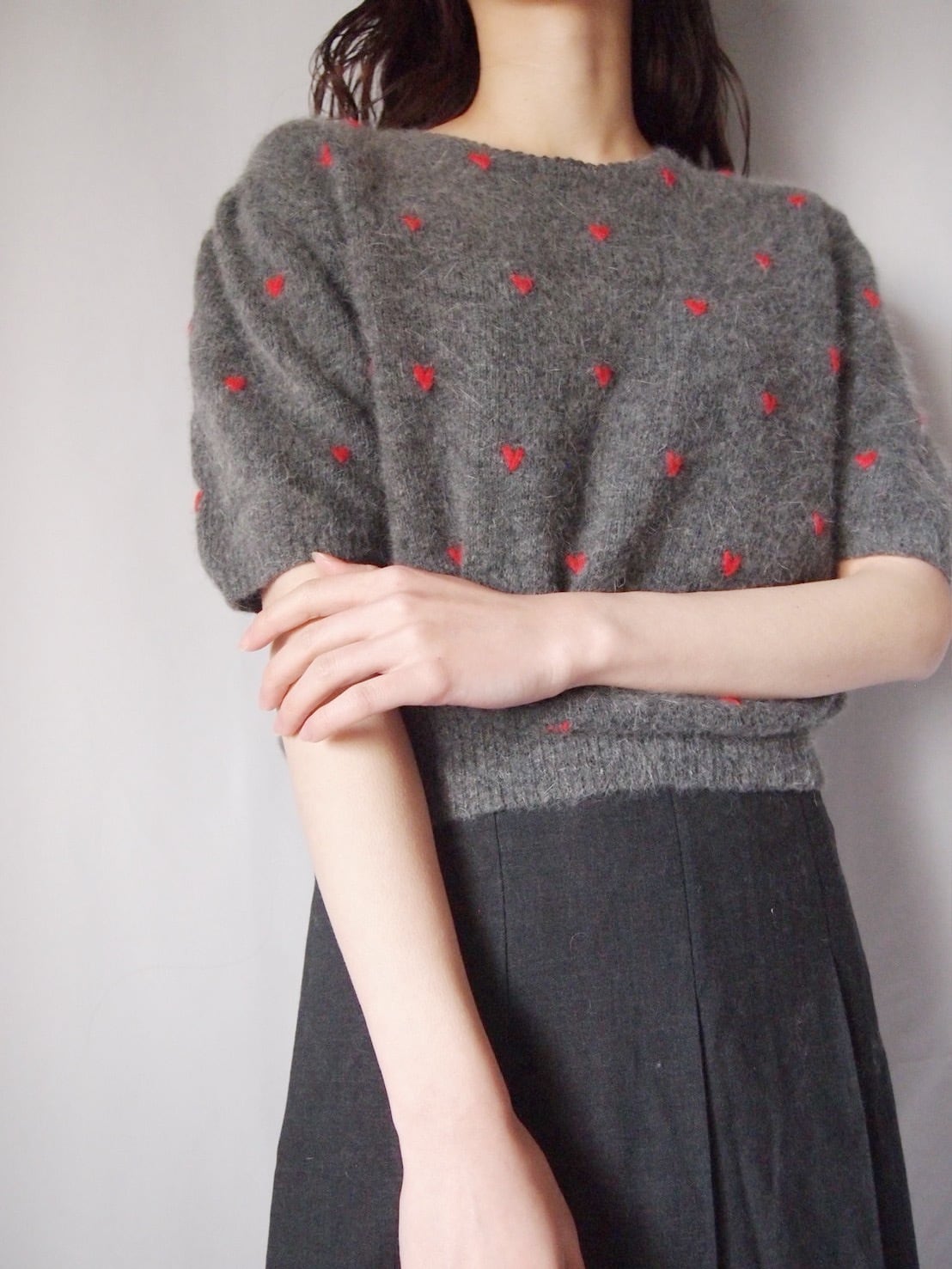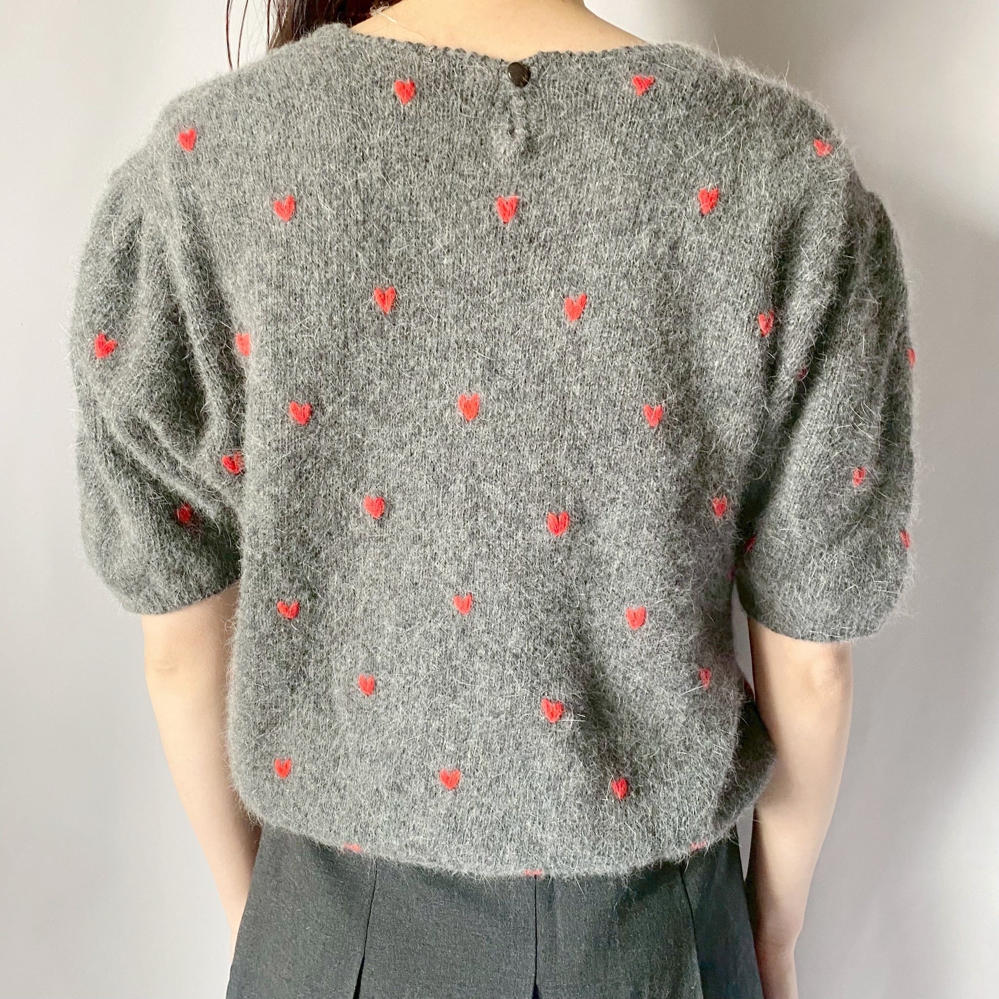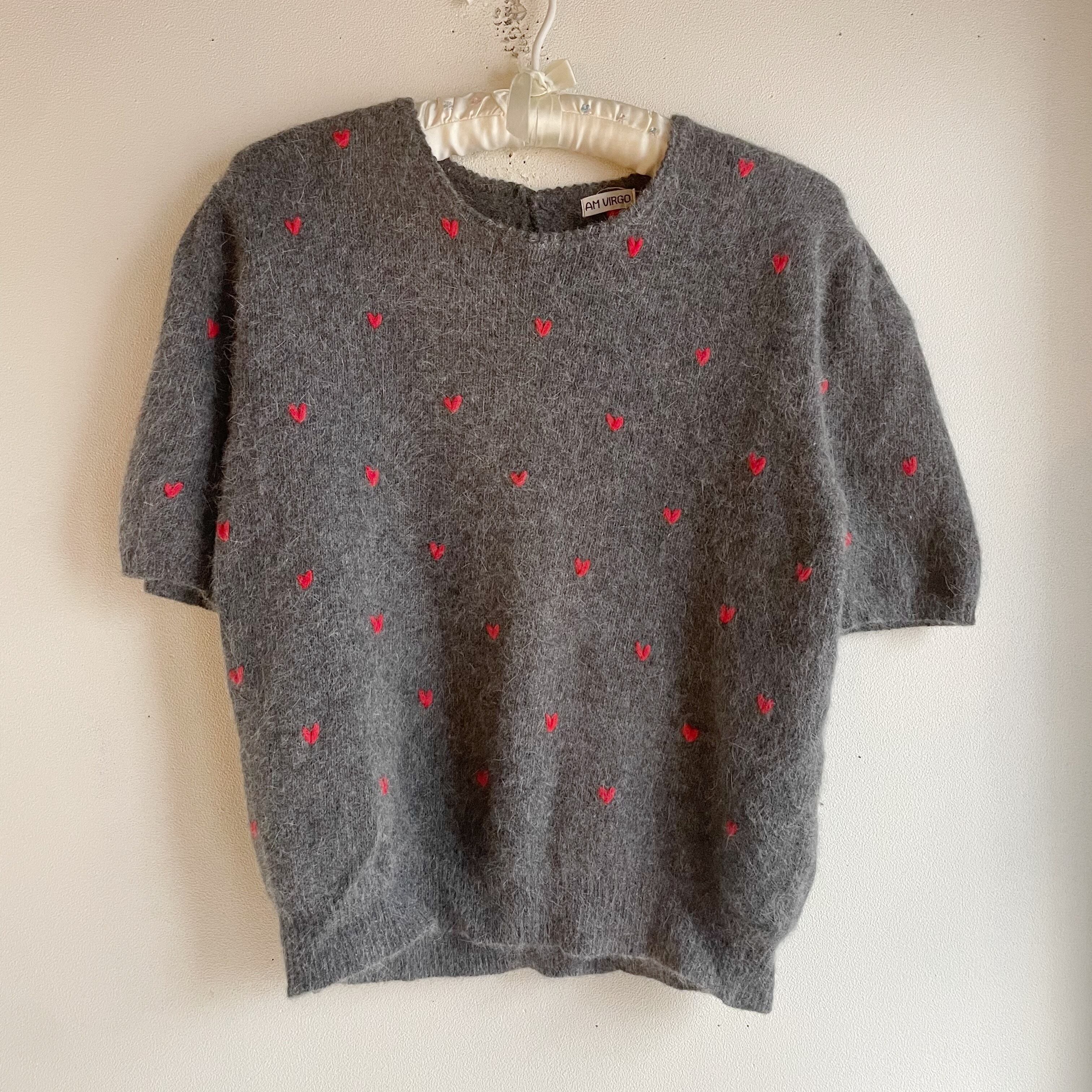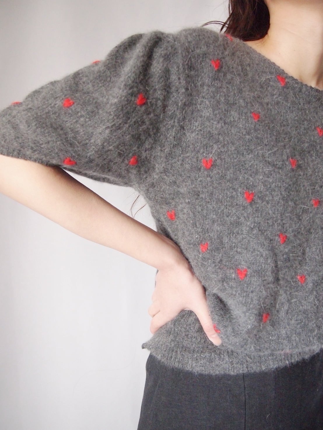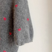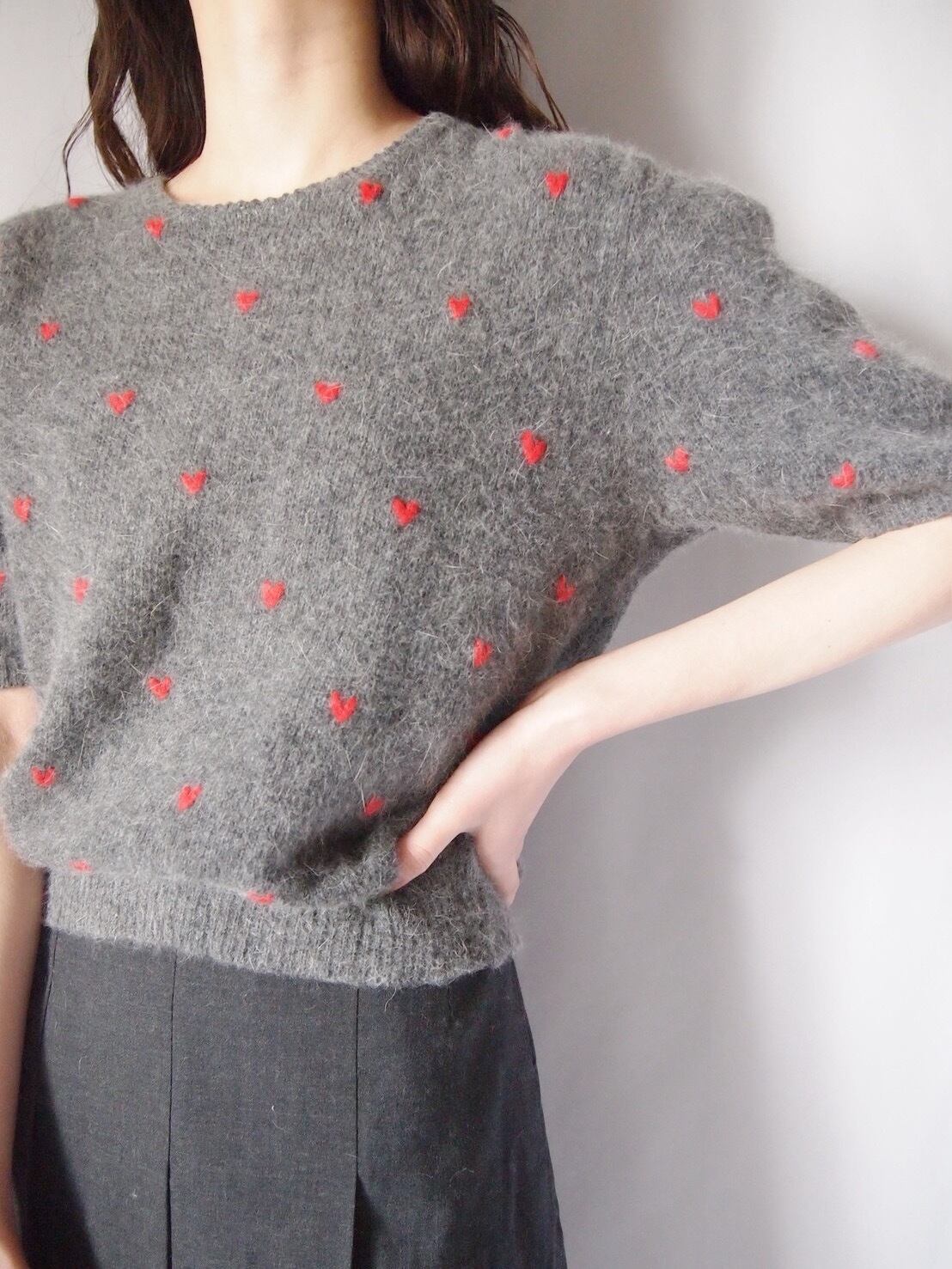 グレー×レッドハートニットトップス