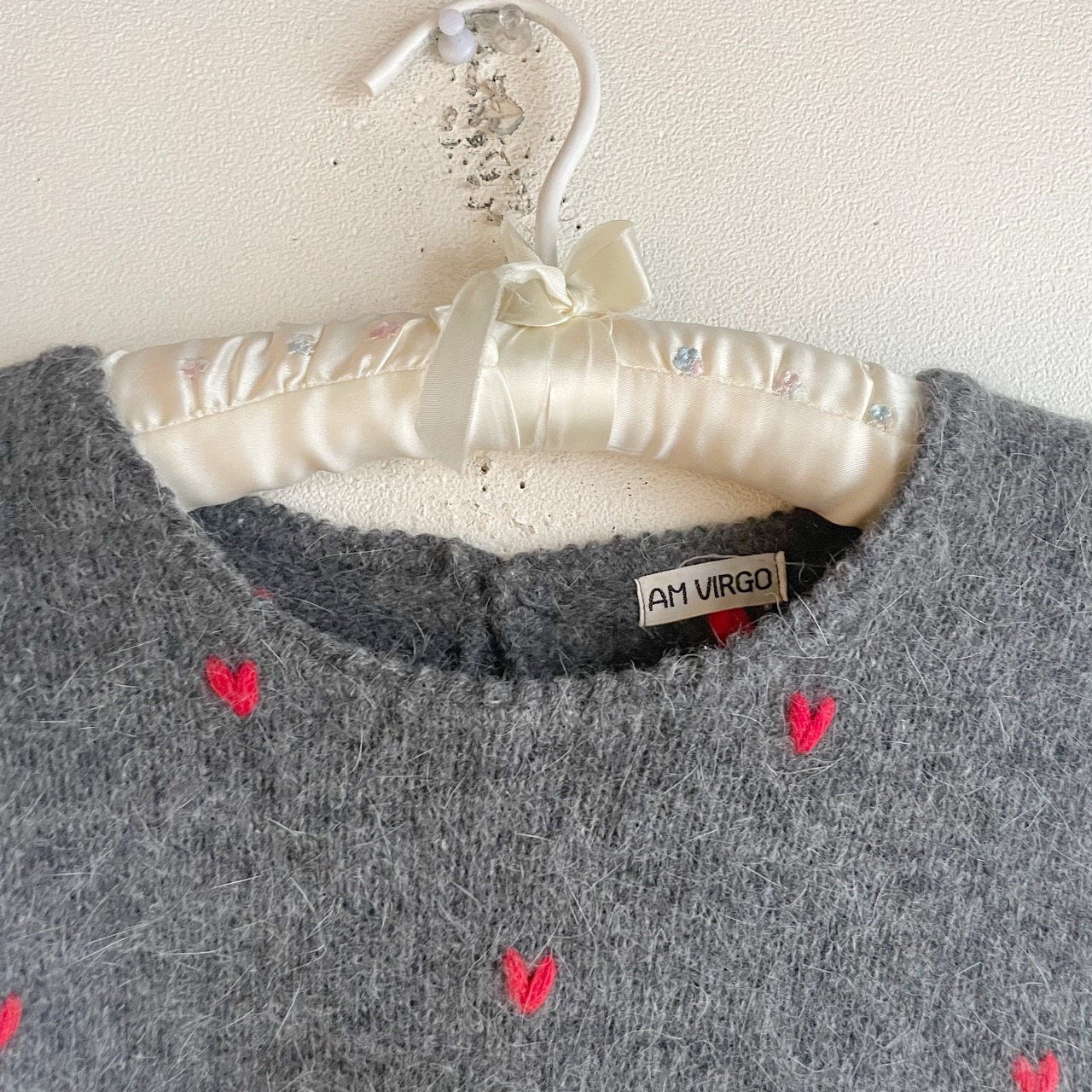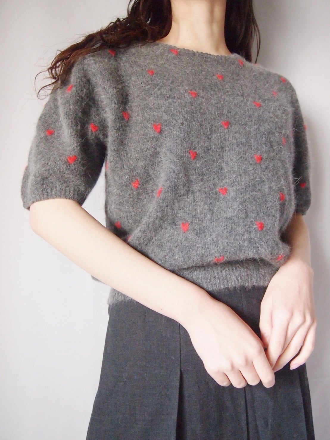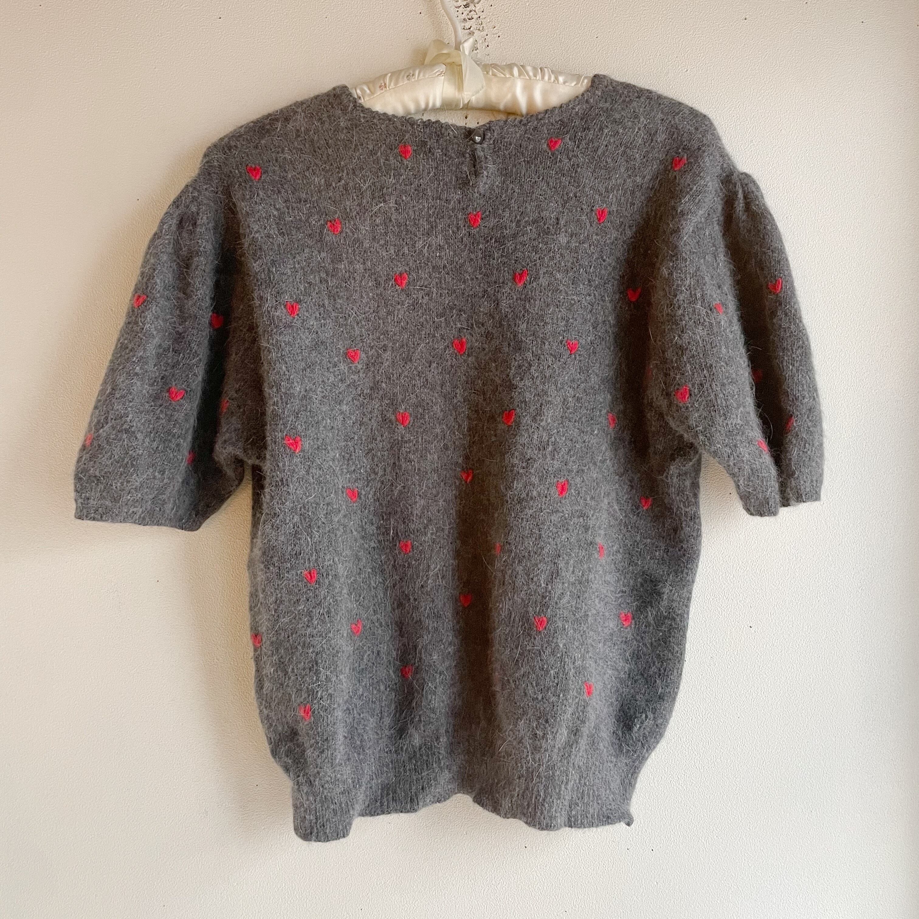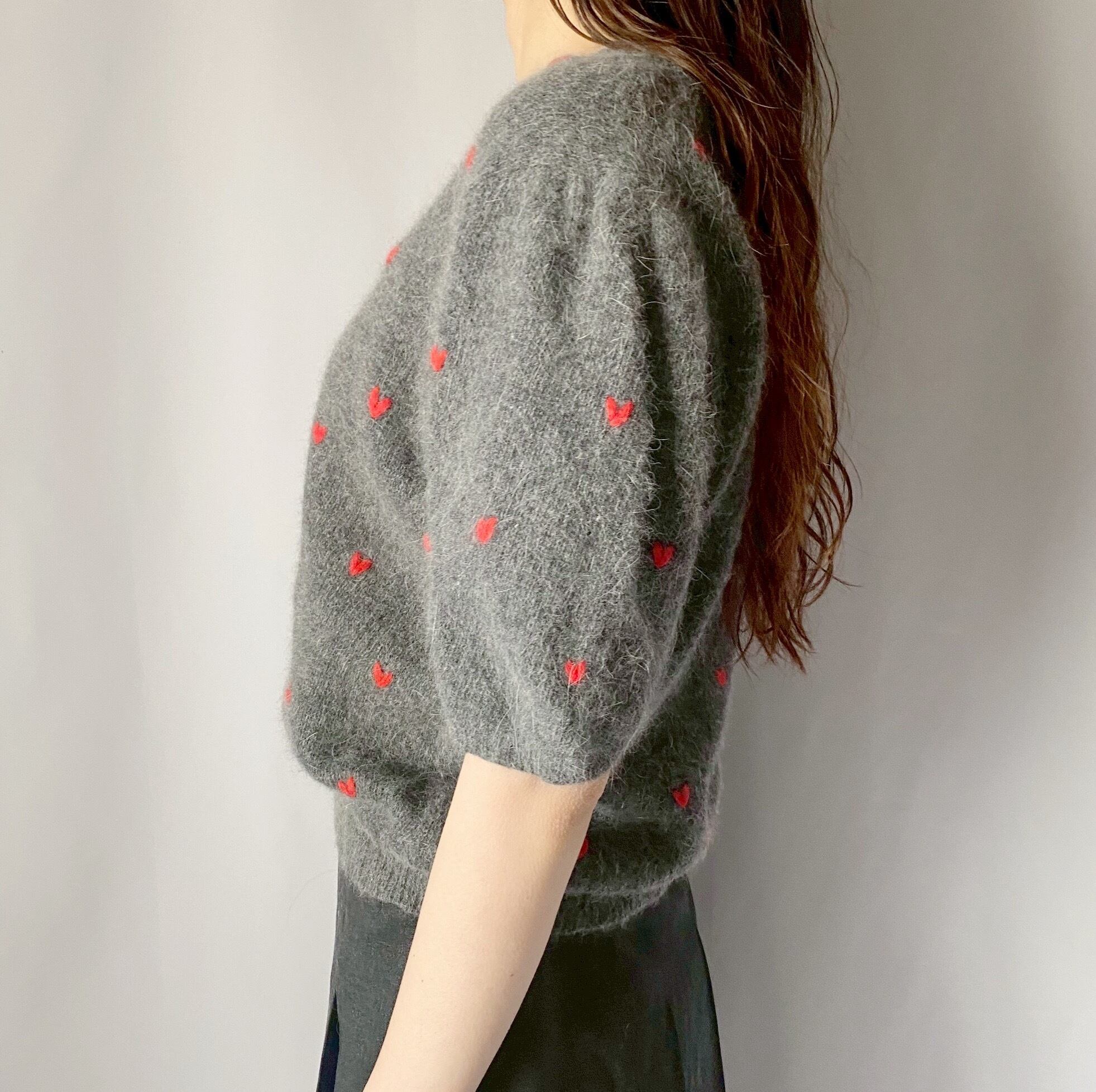 グレー×レッドハートニットトップス