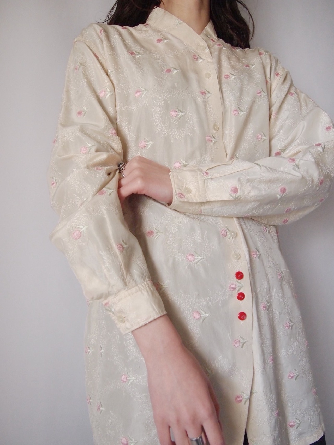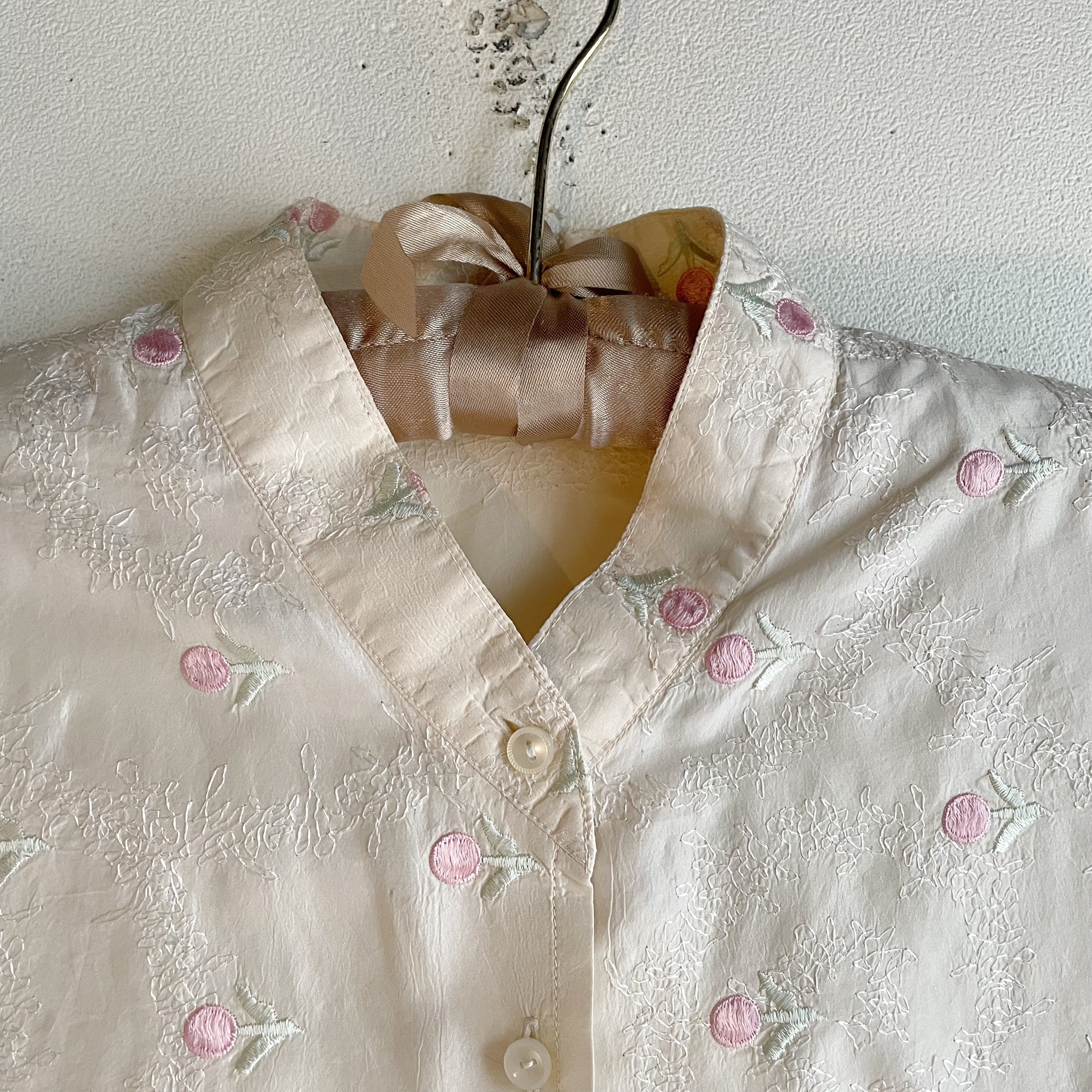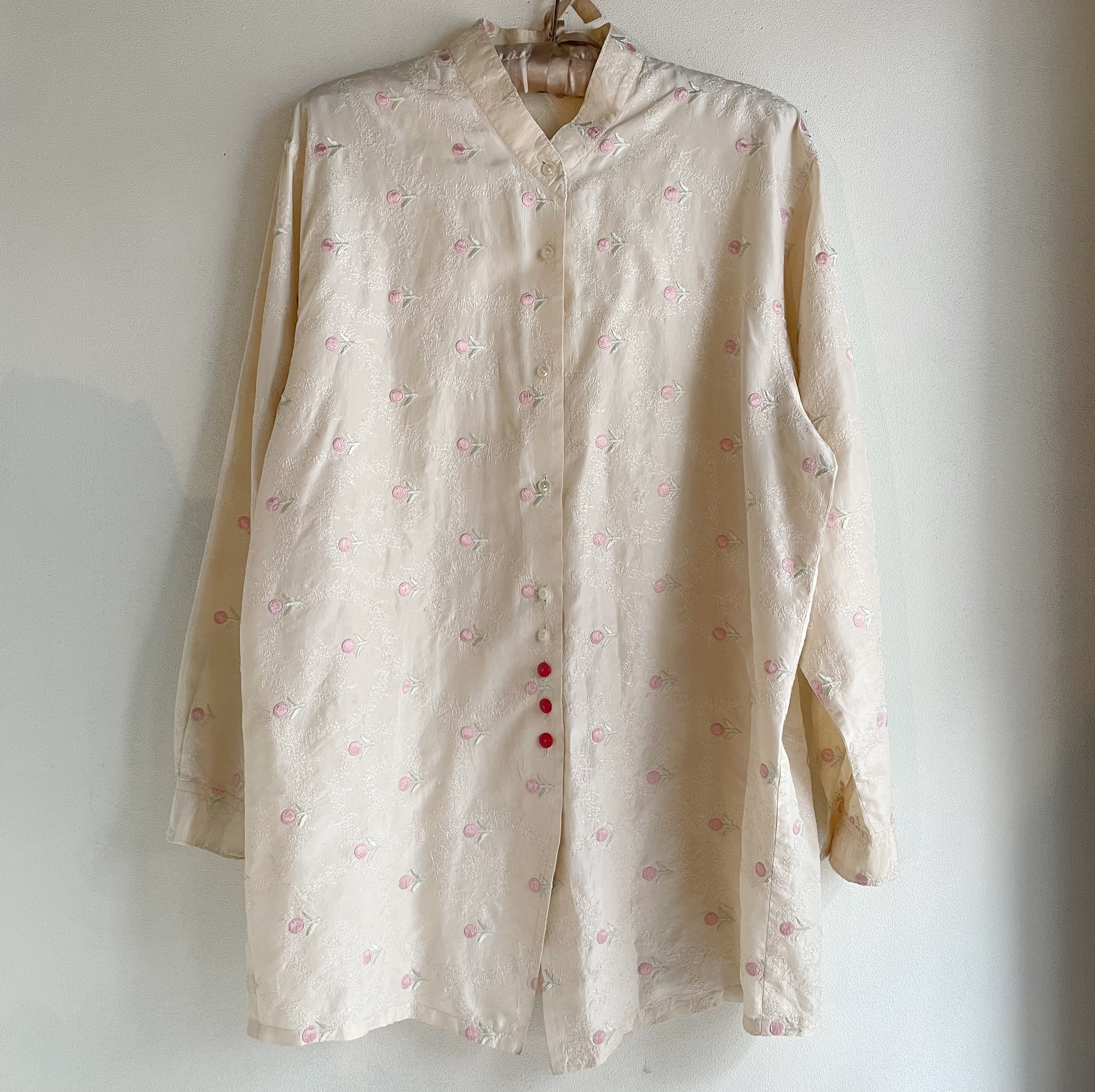 アイボリー×ピンクフラワー刺繍シャツ