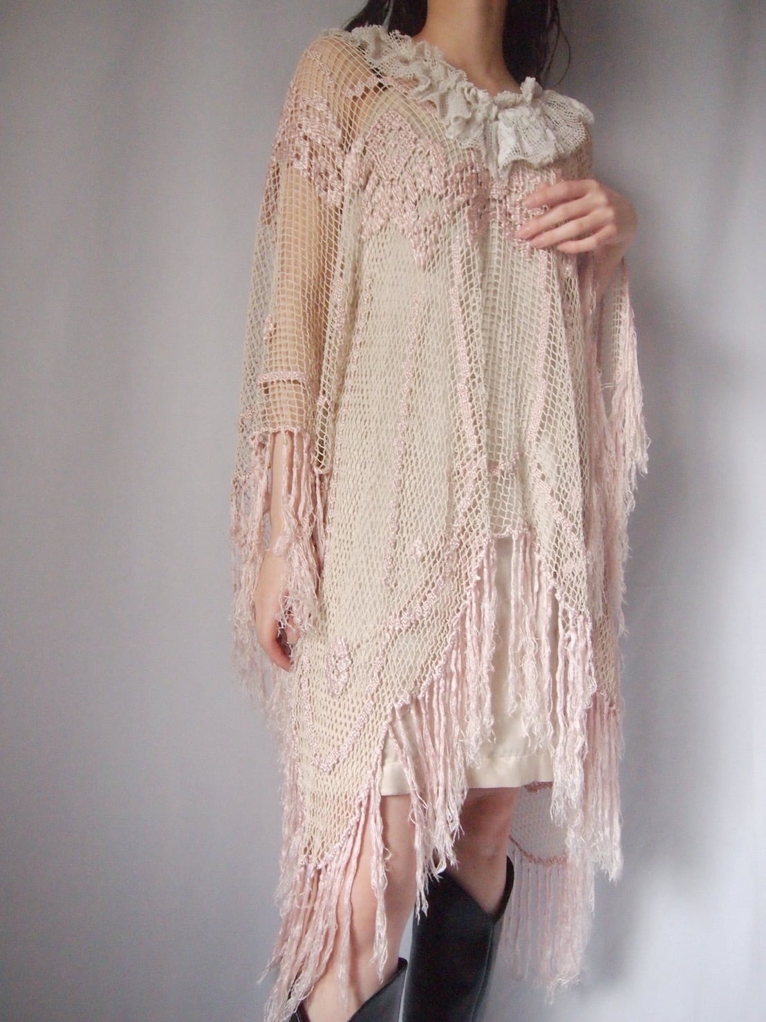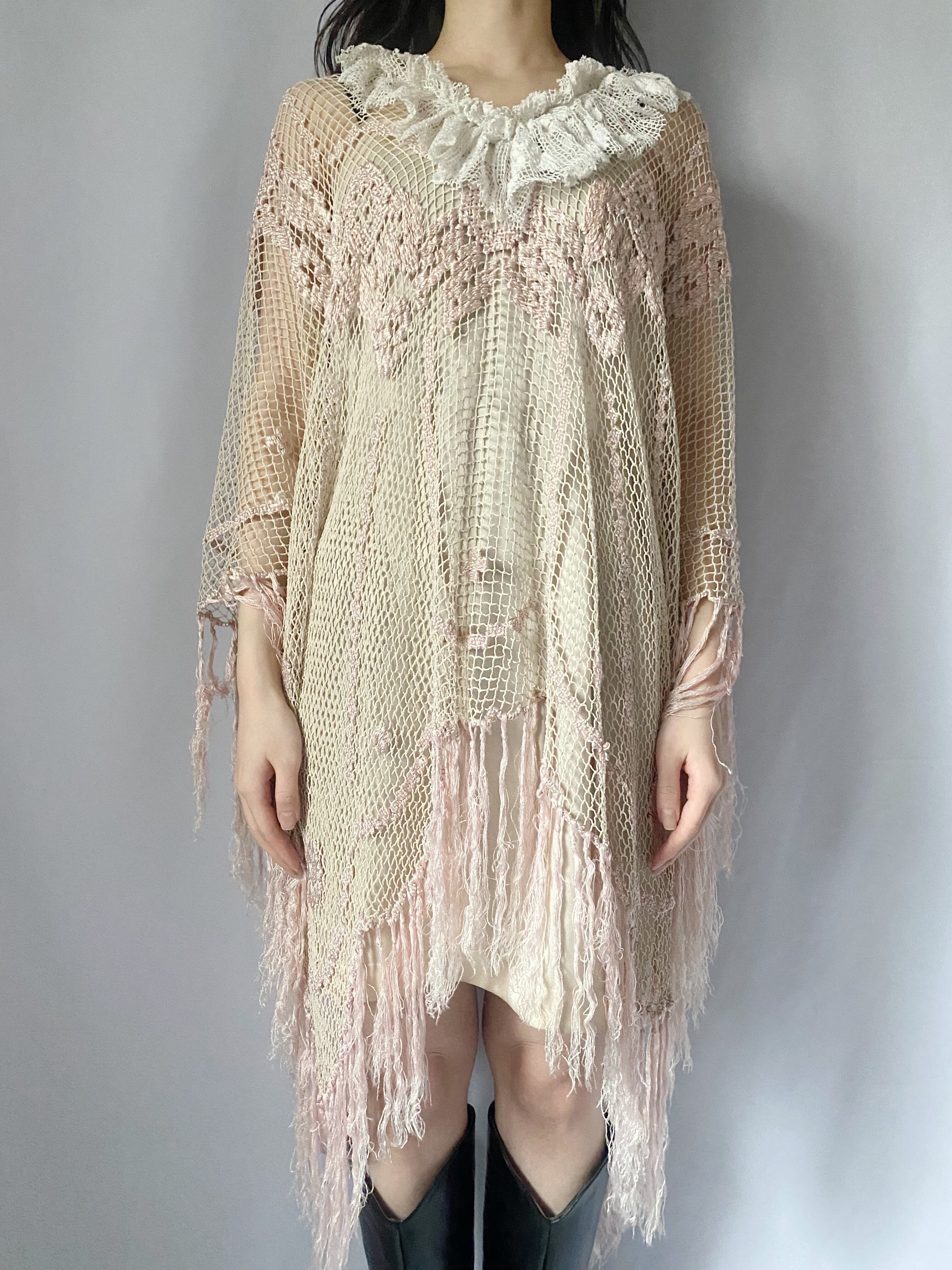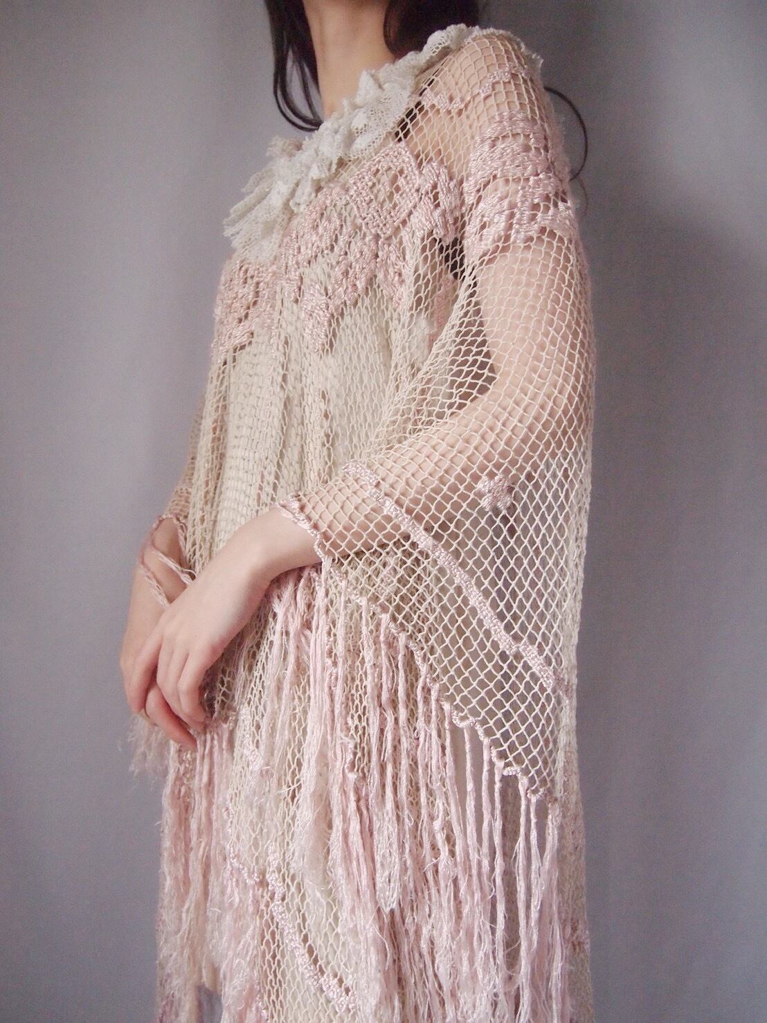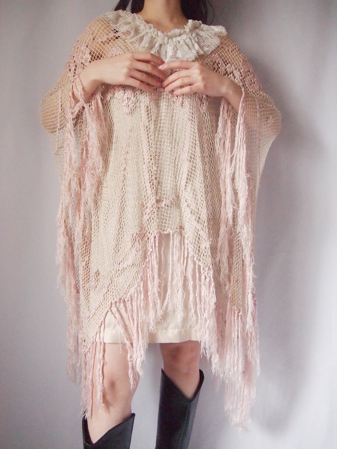 ピンクかぎ編みフリンジポンチョ