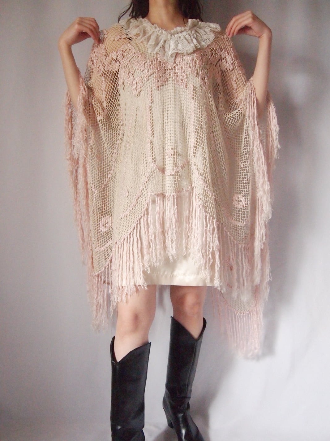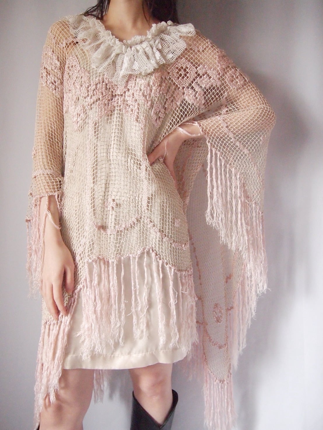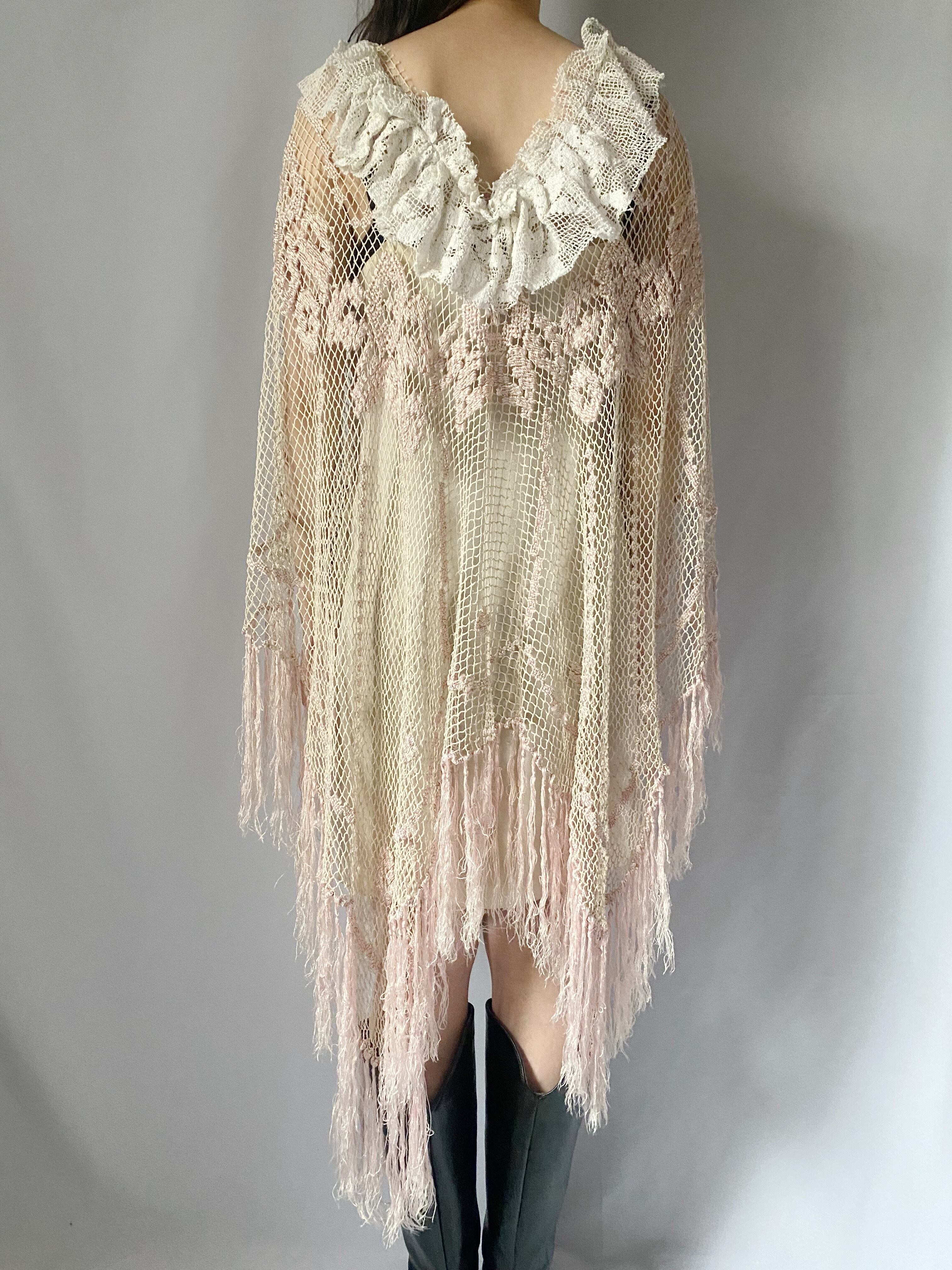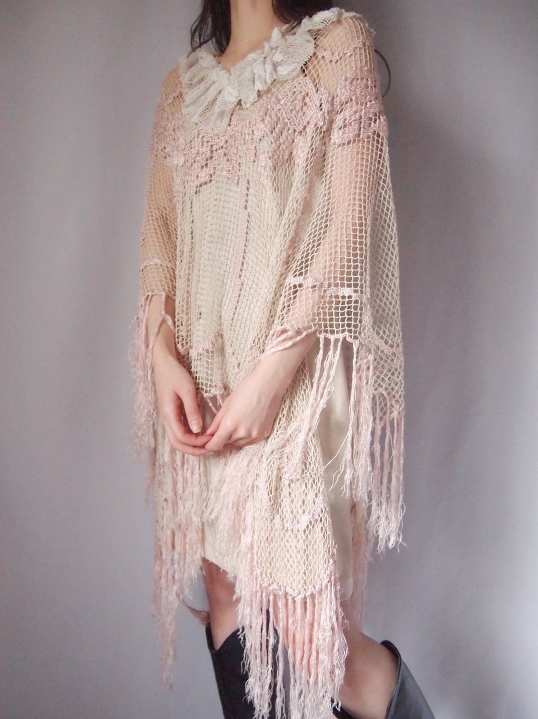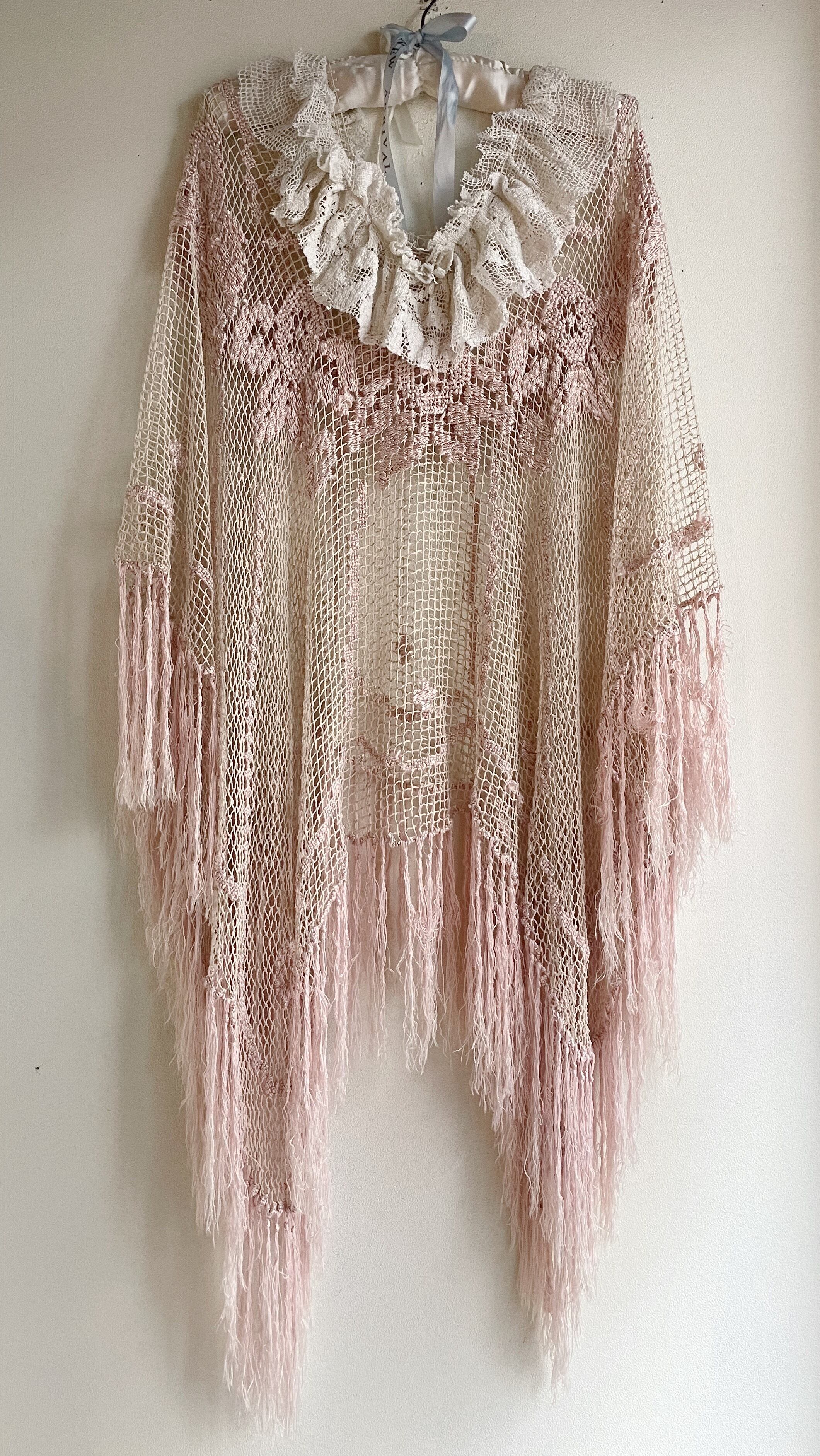 ピンクかぎ編みフリンジポンチョ