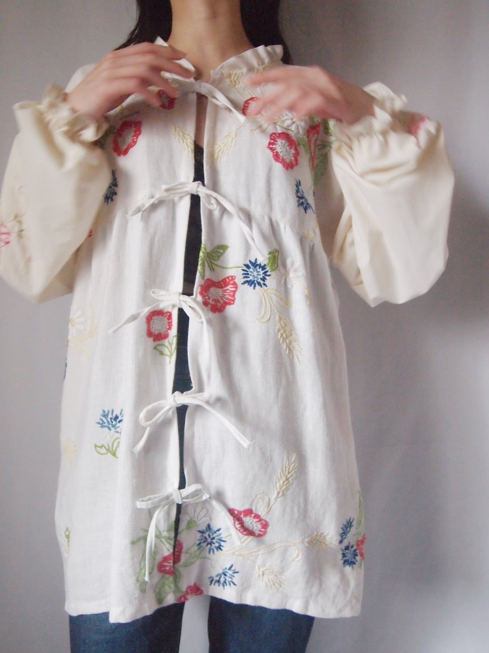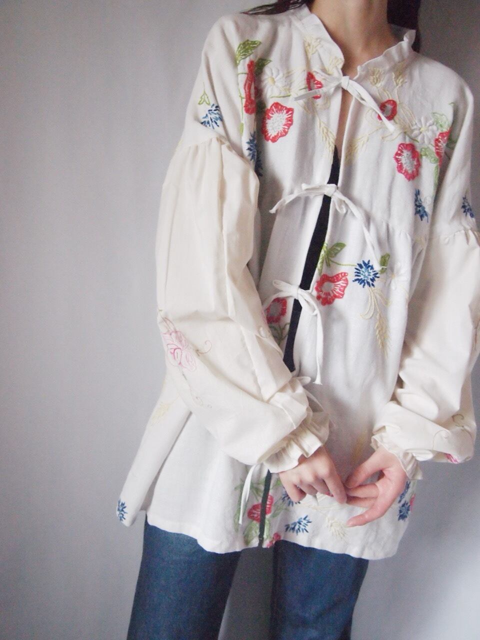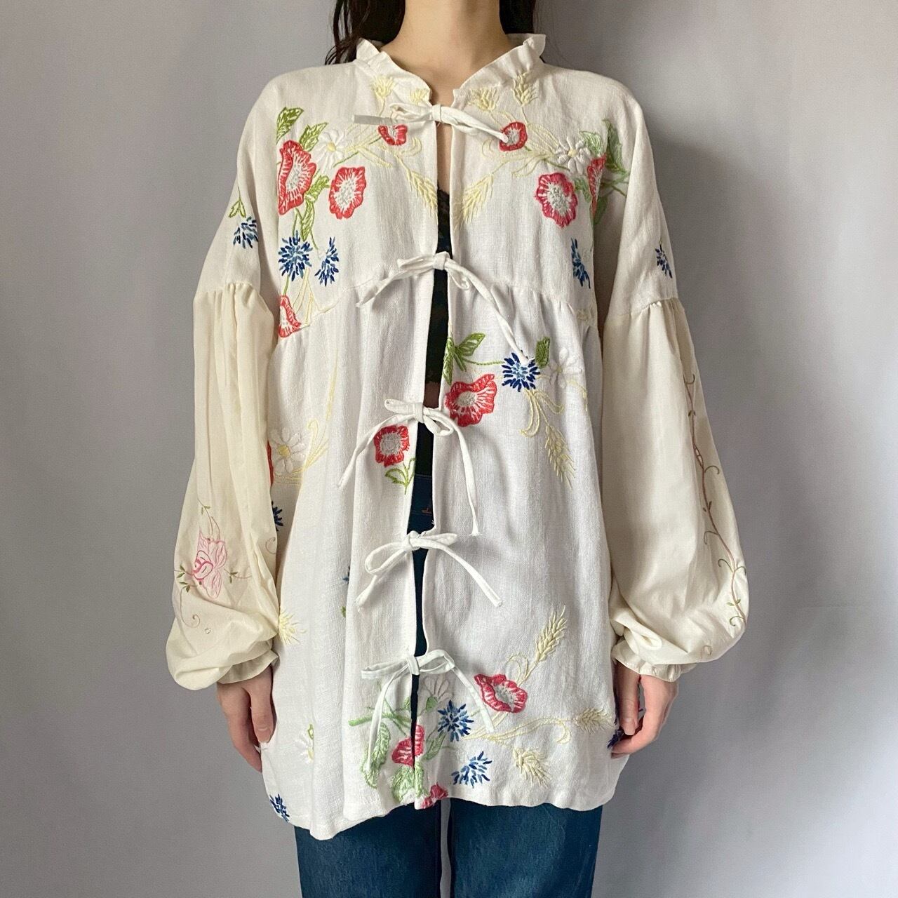 ホワイトお花刺繍リボンブラウス