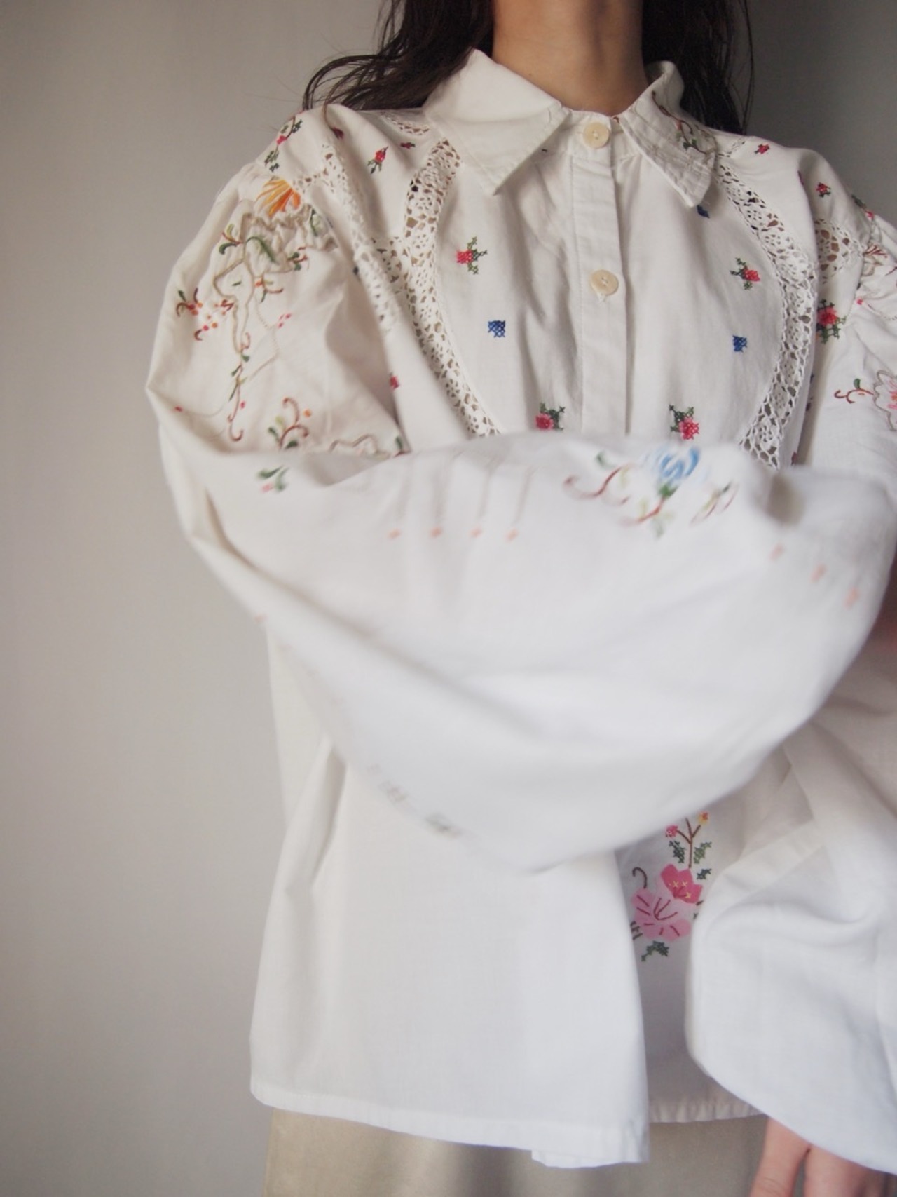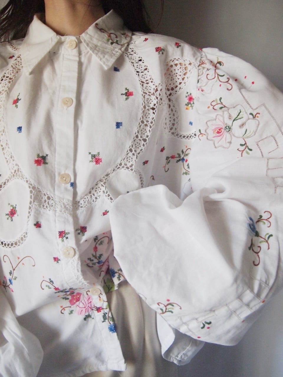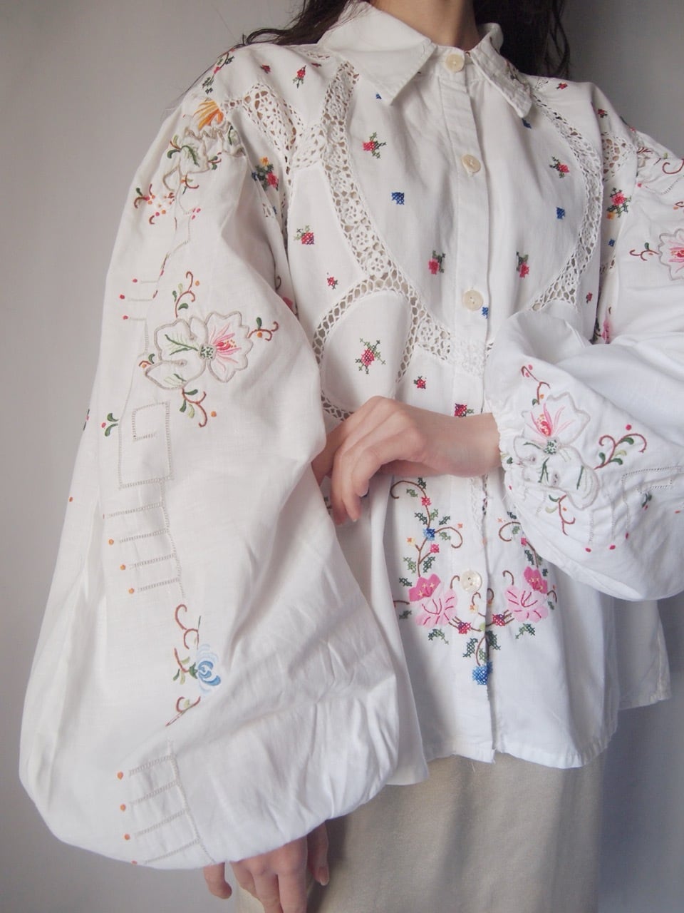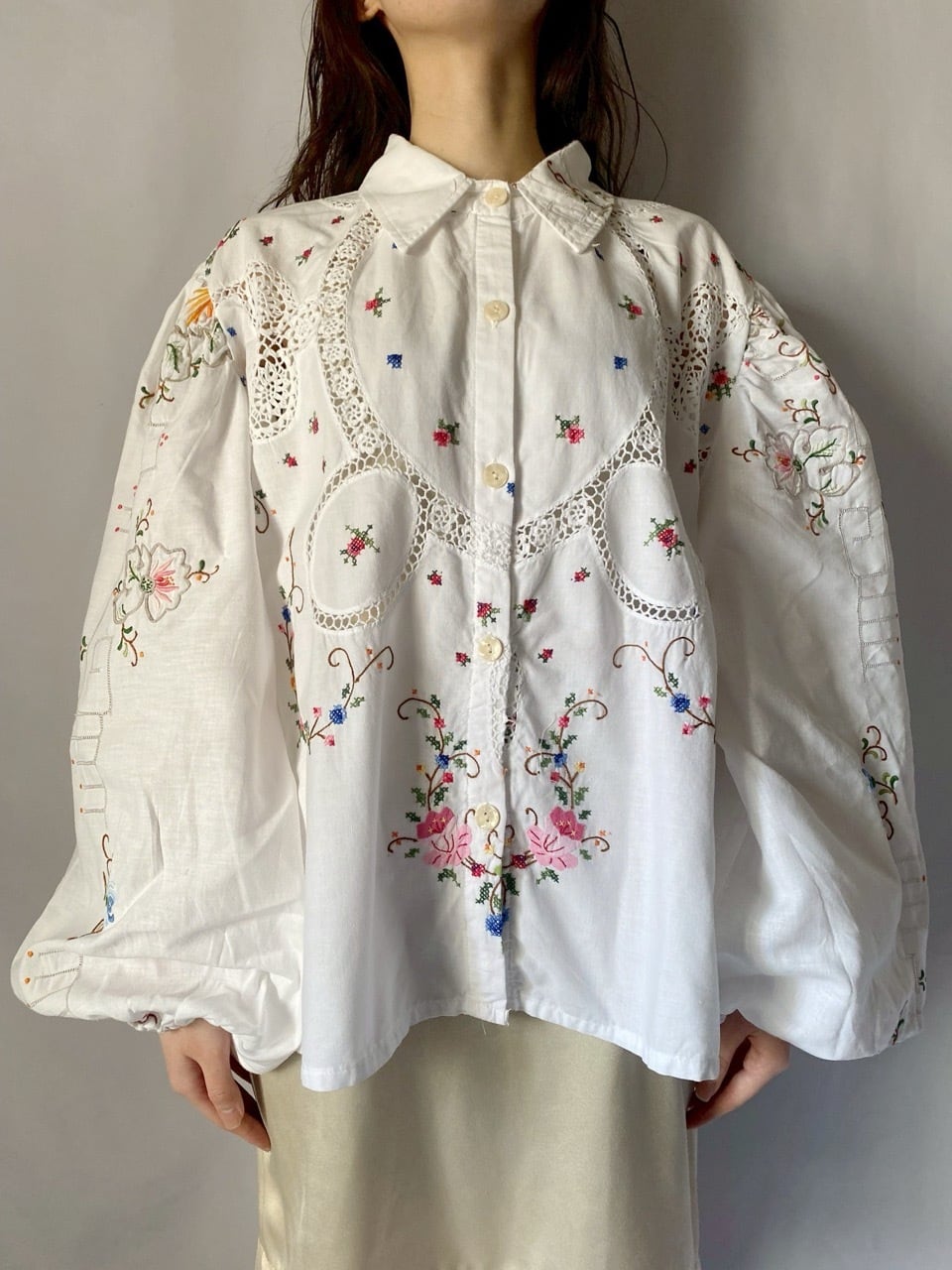 ホワイトお花刺繍ボリュームスリーブシャツ