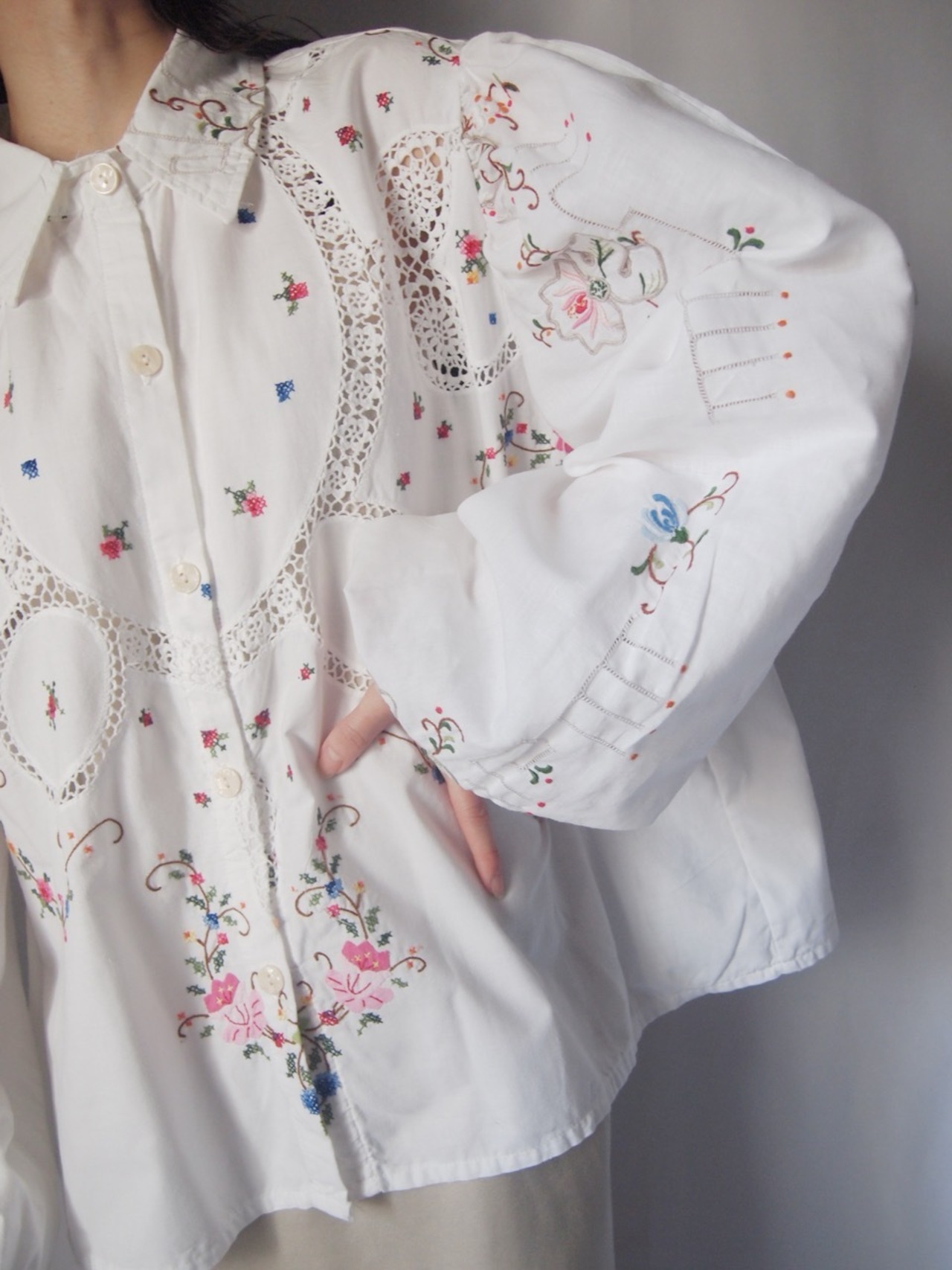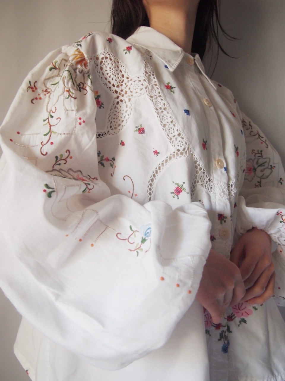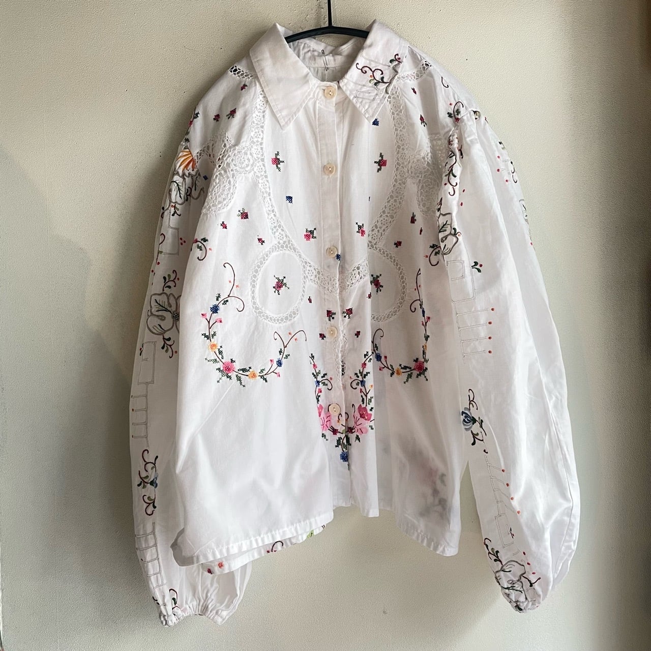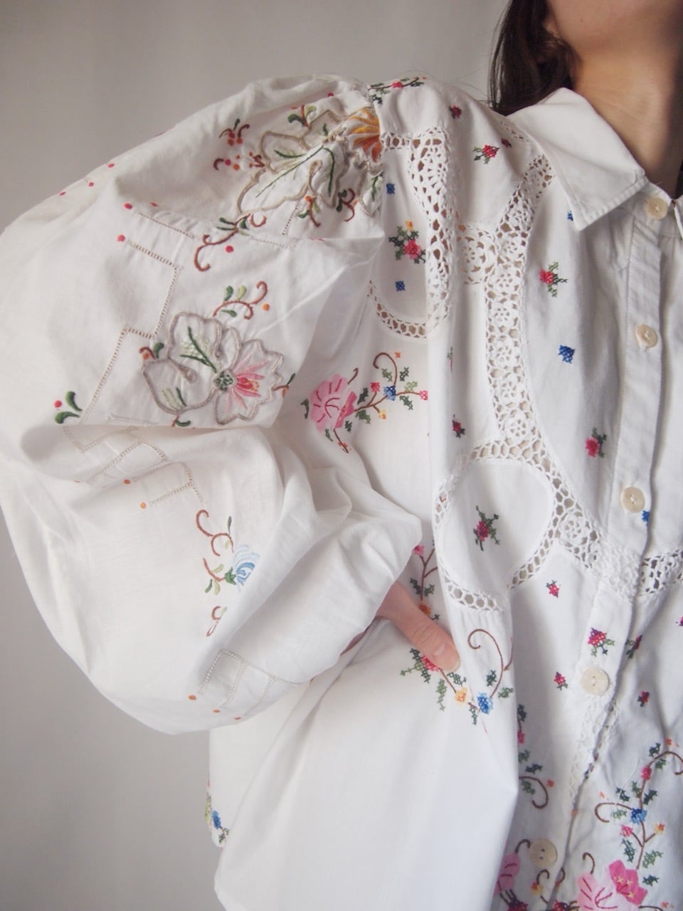ホワイトお花刺繍ボリュームスリーブシャツ