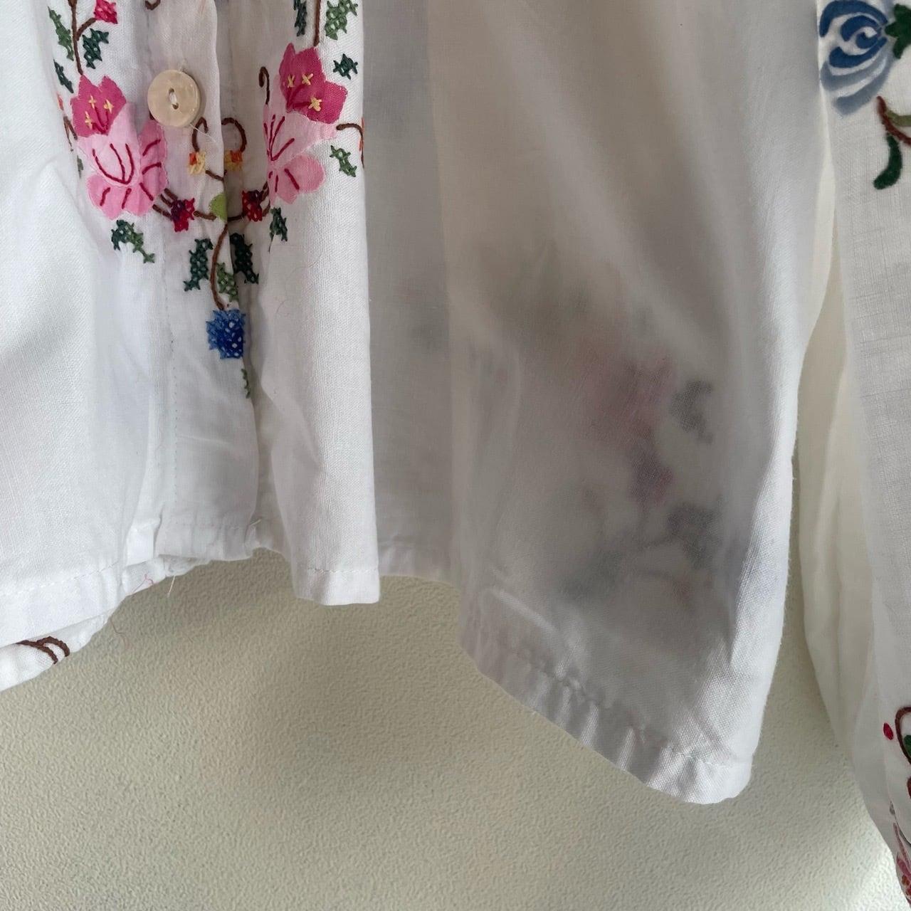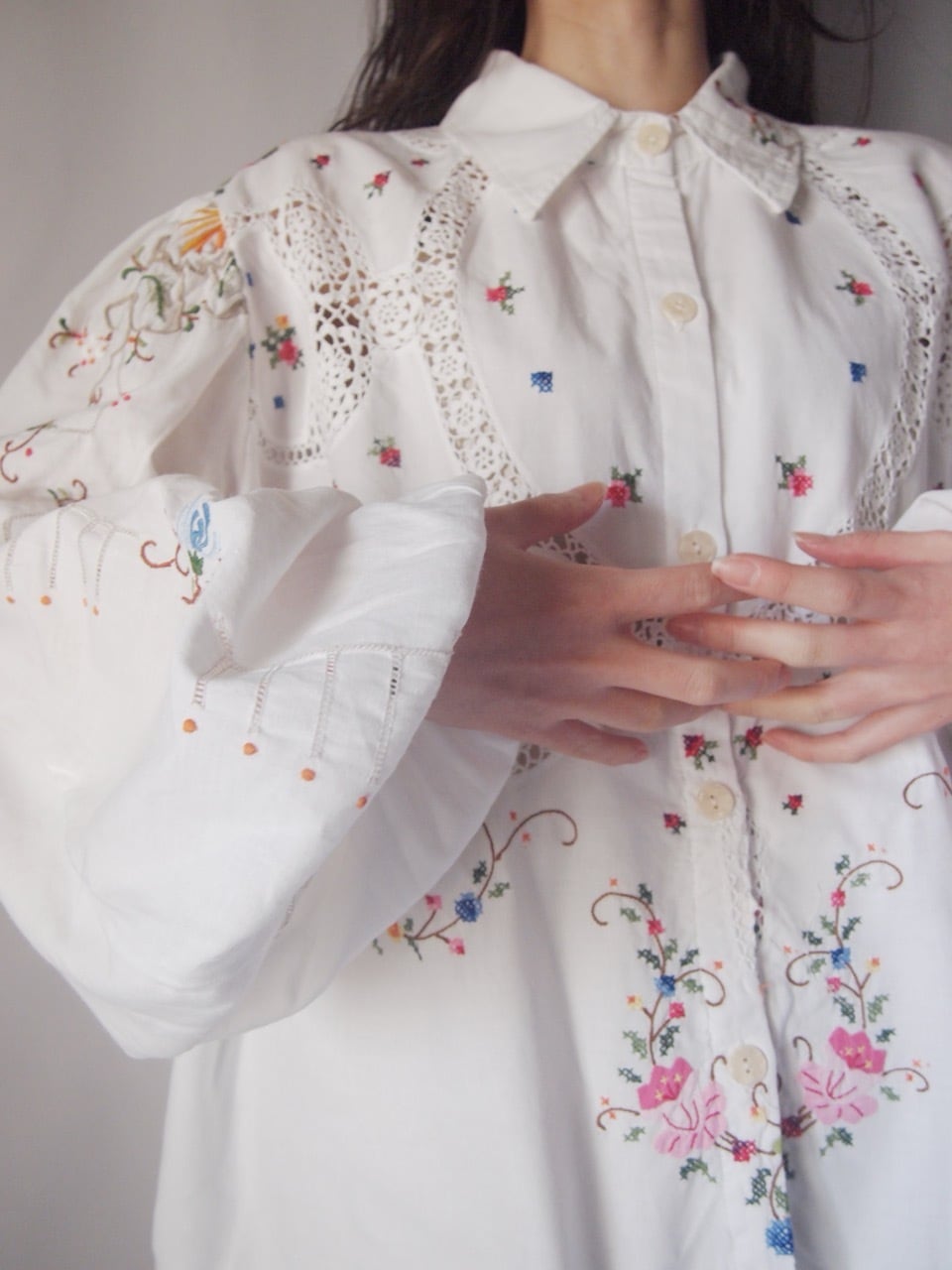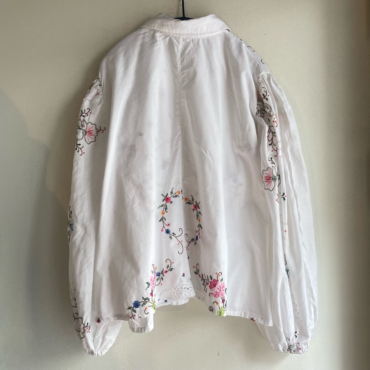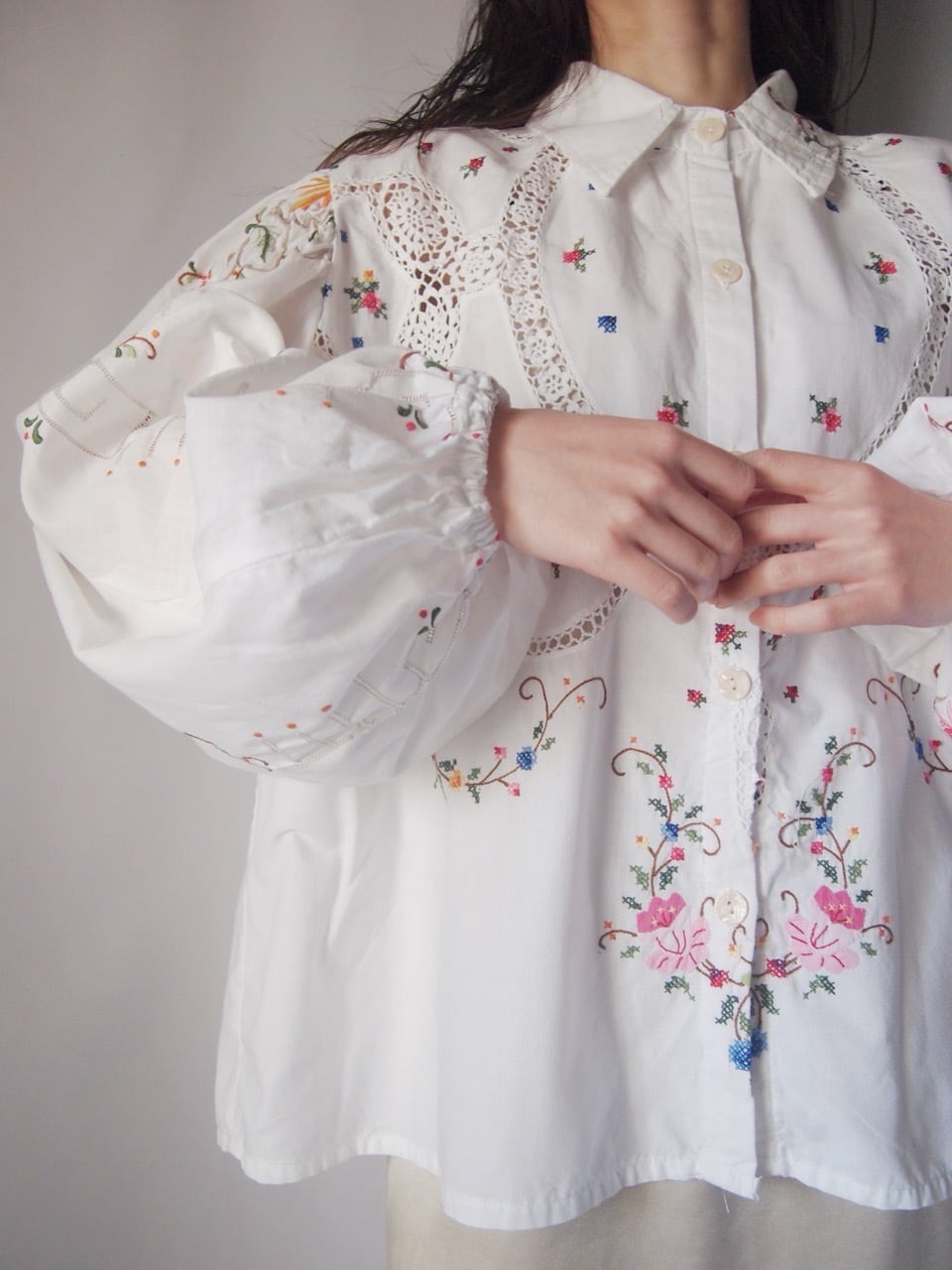 ホワイトお花刺繍ボリュームスリーブシャツ