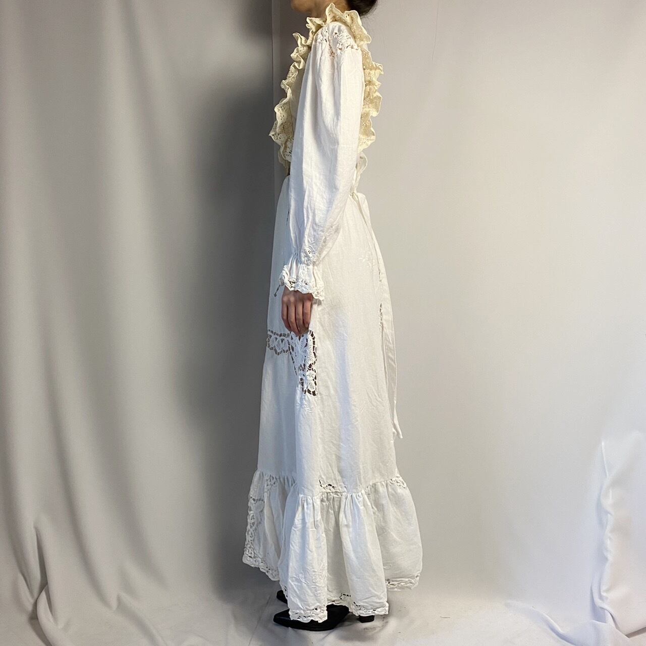 ホワイトゴブラン織りフリルロングワンピース