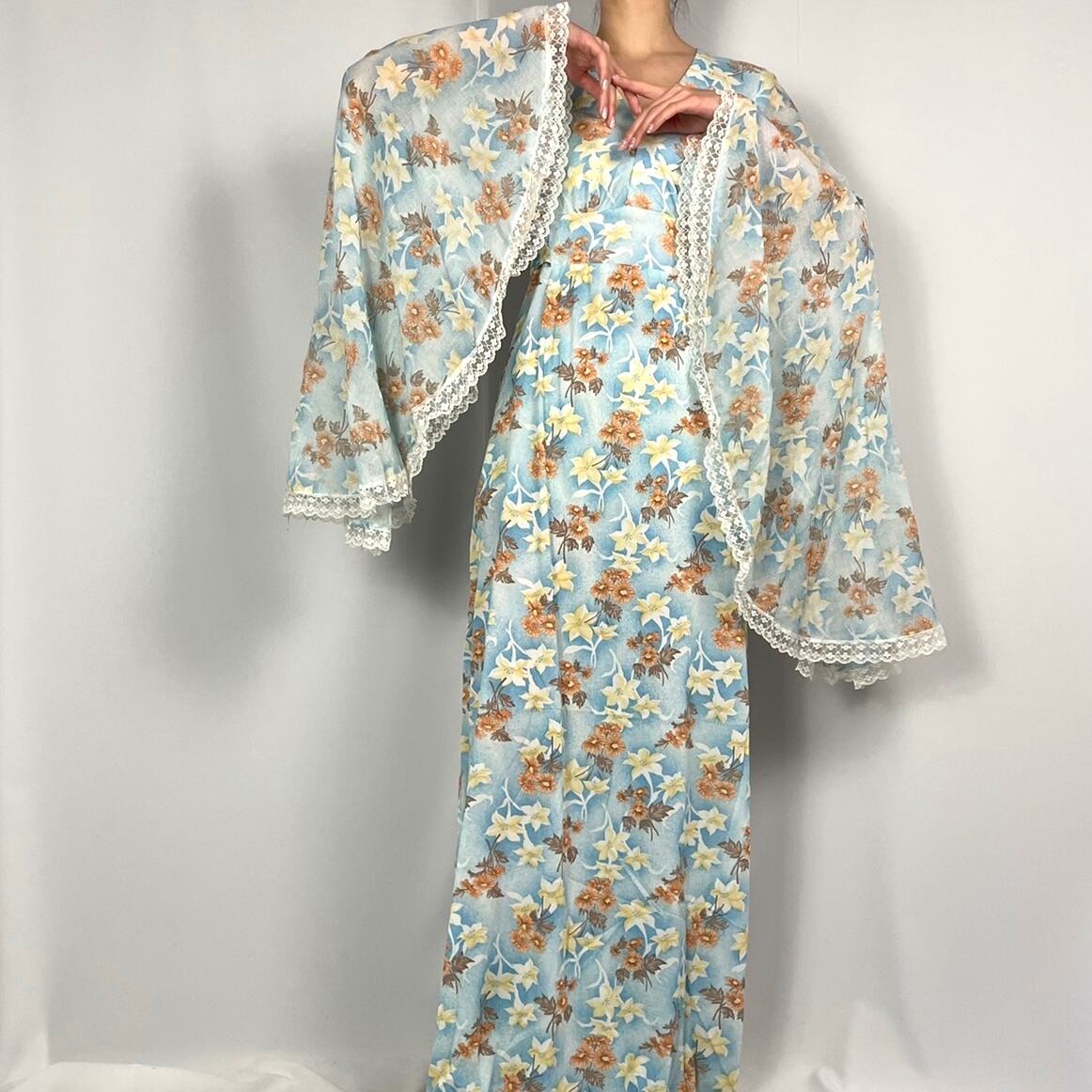 フレアスリーブ花柄ロングワンピース