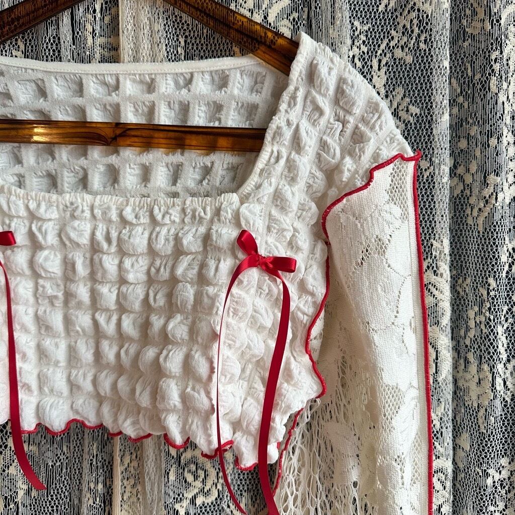 ホワイトショート丈リボントップス